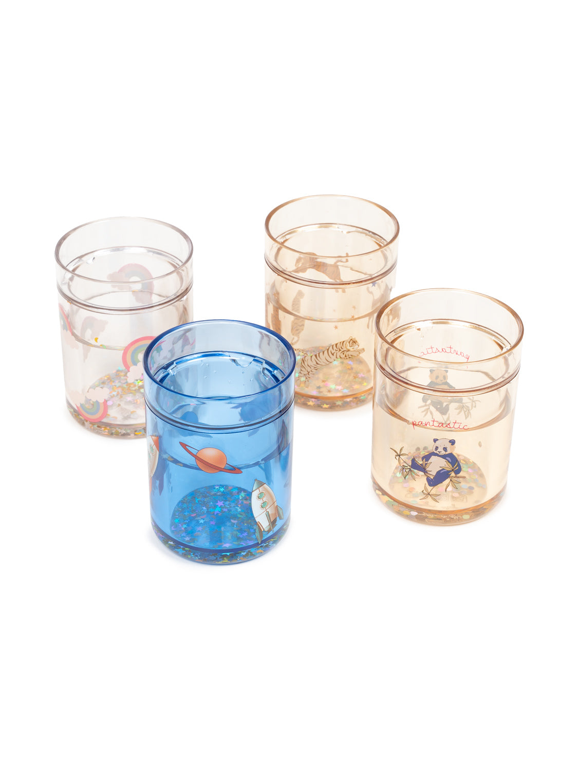 Dieses Glitzerbecher Vierer-Set in Blau Multi von Konges Sløjd begeistert mit einem süßen Design und außergewöhnlicher Liebe zum Detail. Jeder Becher zeichnet sich durch eine sanft abgerundete, ergonomische Form aus, die das Halten für kleine Kinderhände erleichtert. Verschiedene, spannende Motive – Raumschiffe, Pandas, Tiger und Regenbögen – werden harmonisch durch beweglichen Glitzer ergänzt, der das Innere der Seitenwände schmückt und den Bechern bei jeder Bewegung einen verspielten Glanz und kindliche Freude verleiht.