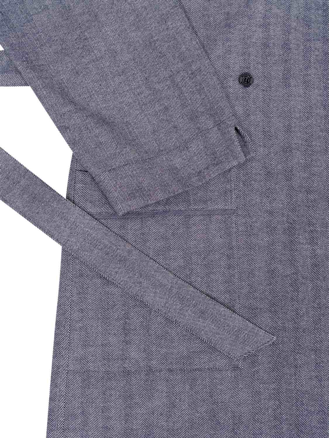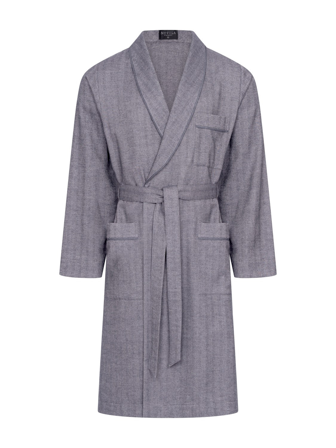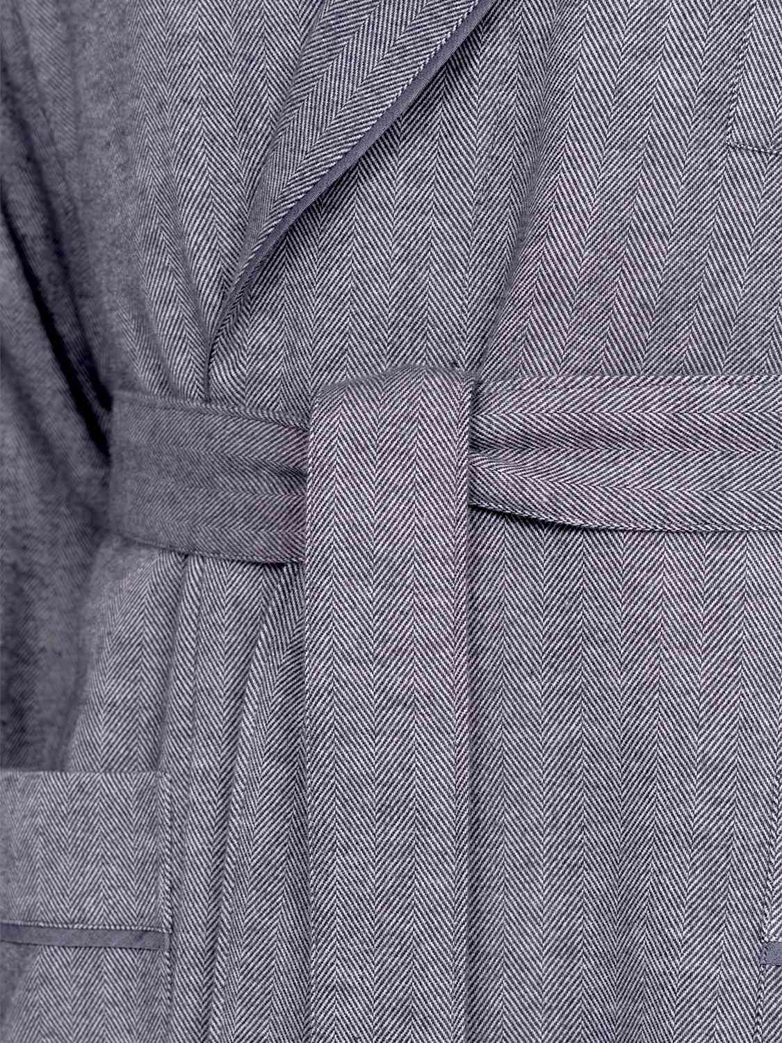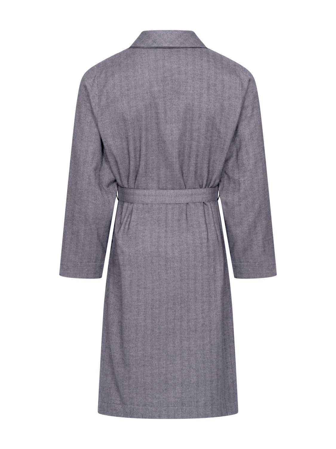 Dieser Hausmantel aus hochwertigem Vollzwirn-Flanell bietet dank seiner beidseitig angerauten Oberfläche ein besonders weiches und warmes Tragegefühl. Das klassische Fischgrat-Design verleiht ihm eine elegante, zeitlose Ausstrahlung. Mit Schalkragen, Ärmelaufschlägen und drei aufgesetzten Taschen verbindet der Mantel Stil und Funktionalität. Er wird mit einem Bindegürtel geschlossen, der eine bequeme Weitenregulierung ermöglicht. Durch den Verzicht auf ein Innenfutter bleibt der Mantel angenehm leicht und ist perfekt für entspannte Momente zuhause.