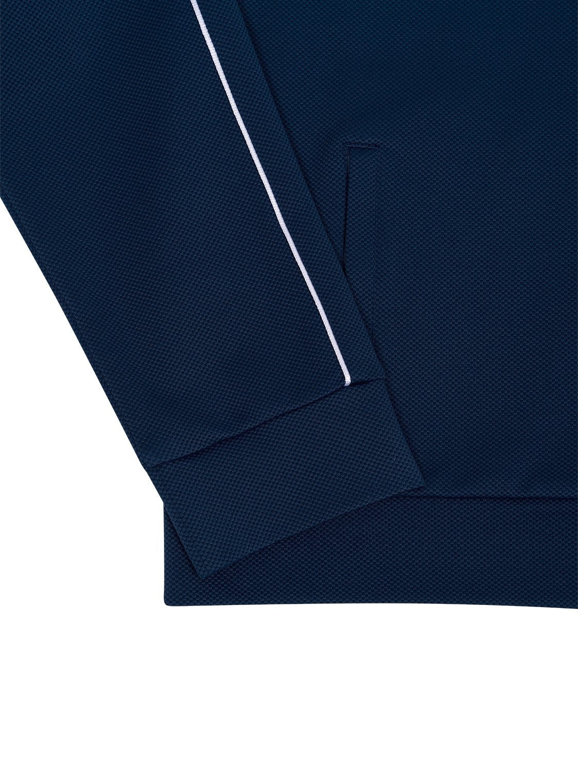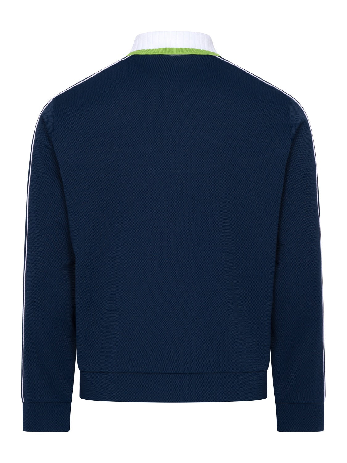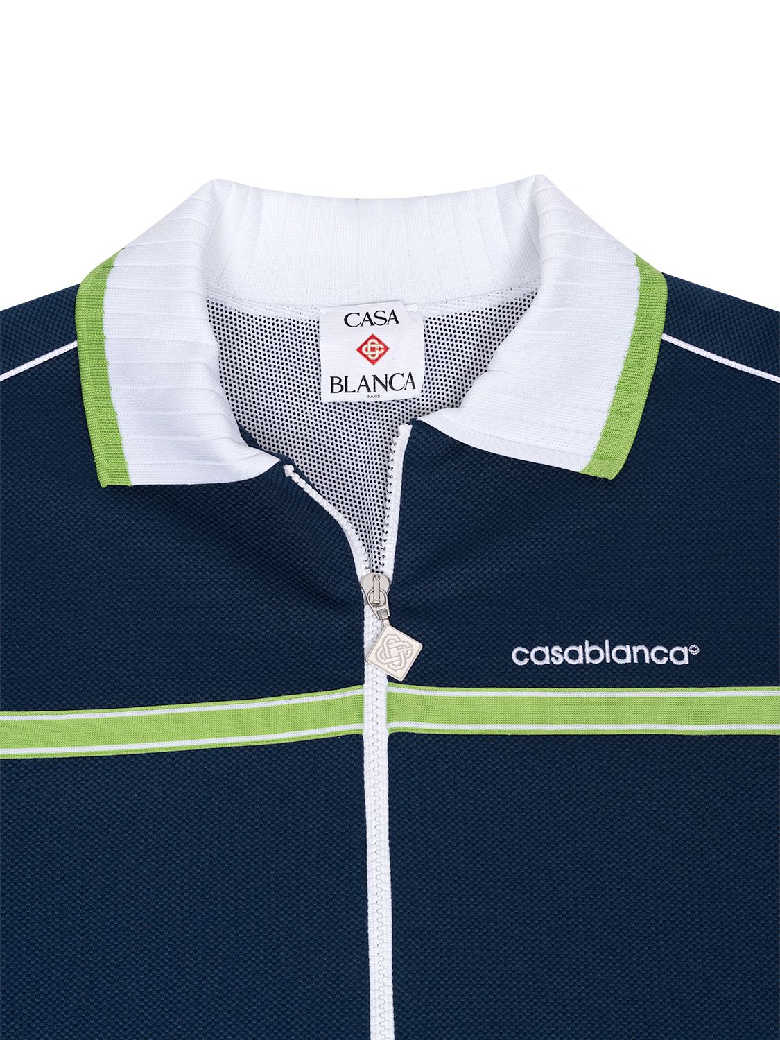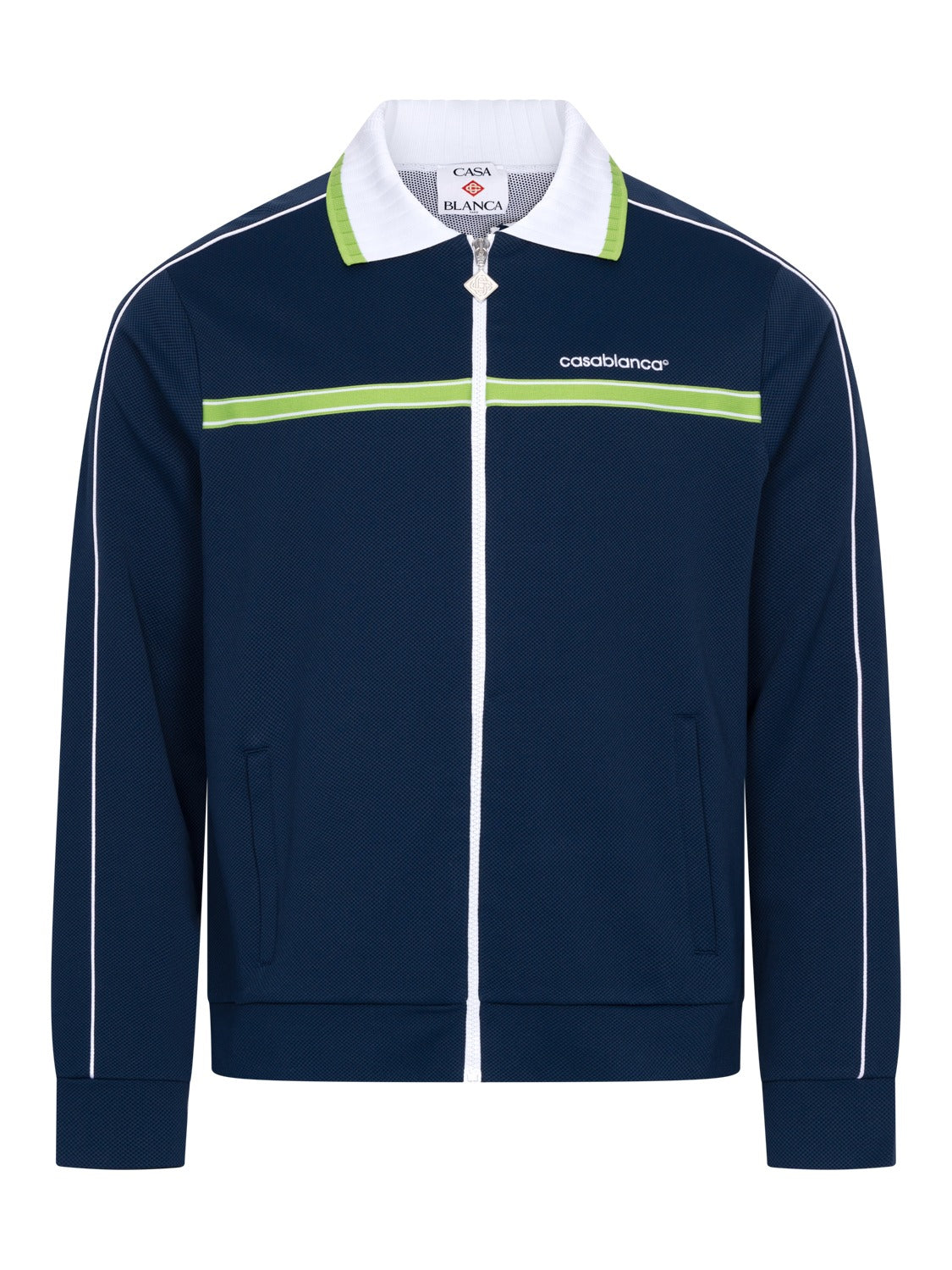 Die Piqué Track Jacket von Casablanca verbindet klassische Sportwear mit luxuriösen Details. Das Modell mit langen Ärmeln trägt das unverkennbare Casablanca-Logo und überzeugt durch einen durchgehenden Reißverschluss, dessen Zipper-Tab mit dem ikonischen Diamantlogo des Hauses verziert ist. Ein gerippter Kragen sowie gerippte Abschlüsse an Saum und Ärmeln sorgen für eine perfekte Passform. Auffällige grüne und weiße Streifen auf der Brust und feine Paspelierungen entlang der Schultern und Ärmel verleihen der Jacke einen dynamischen, eleganten Charakter. Das gefütterte Innenleben rundet das hochwertige Design ab und macht die Track Jacket zu einem stilvollen Begleiter für sportliche wie auch casual Looks.