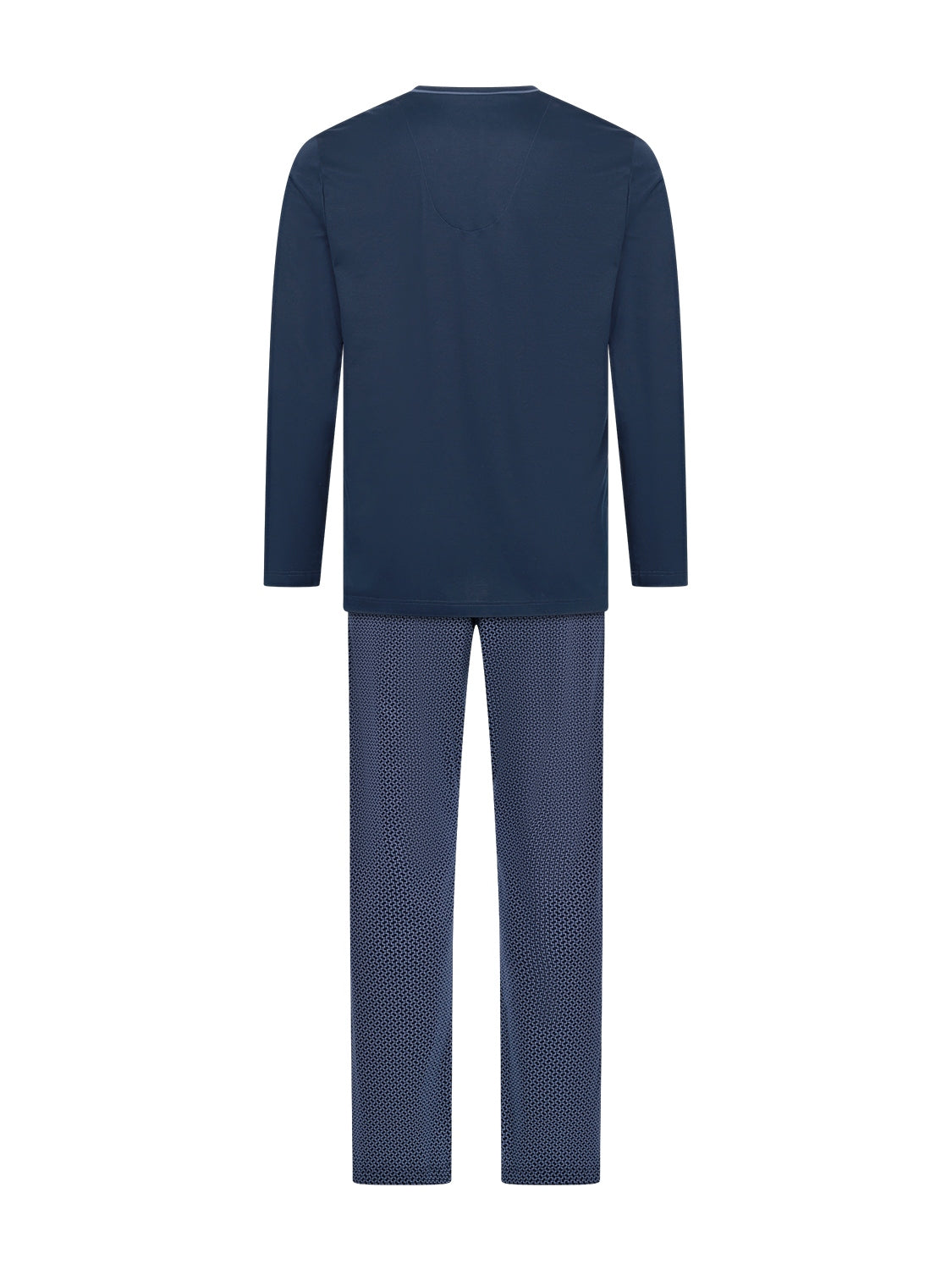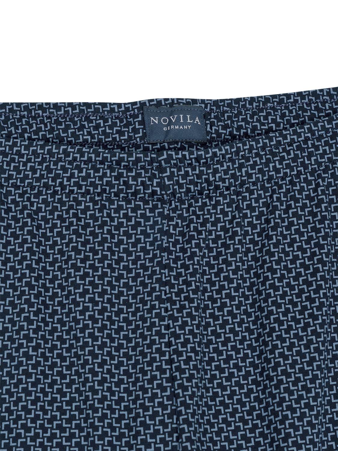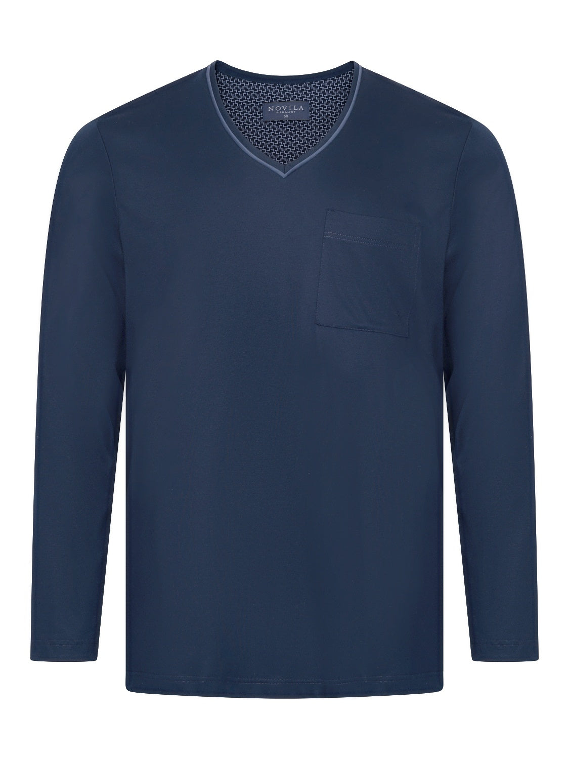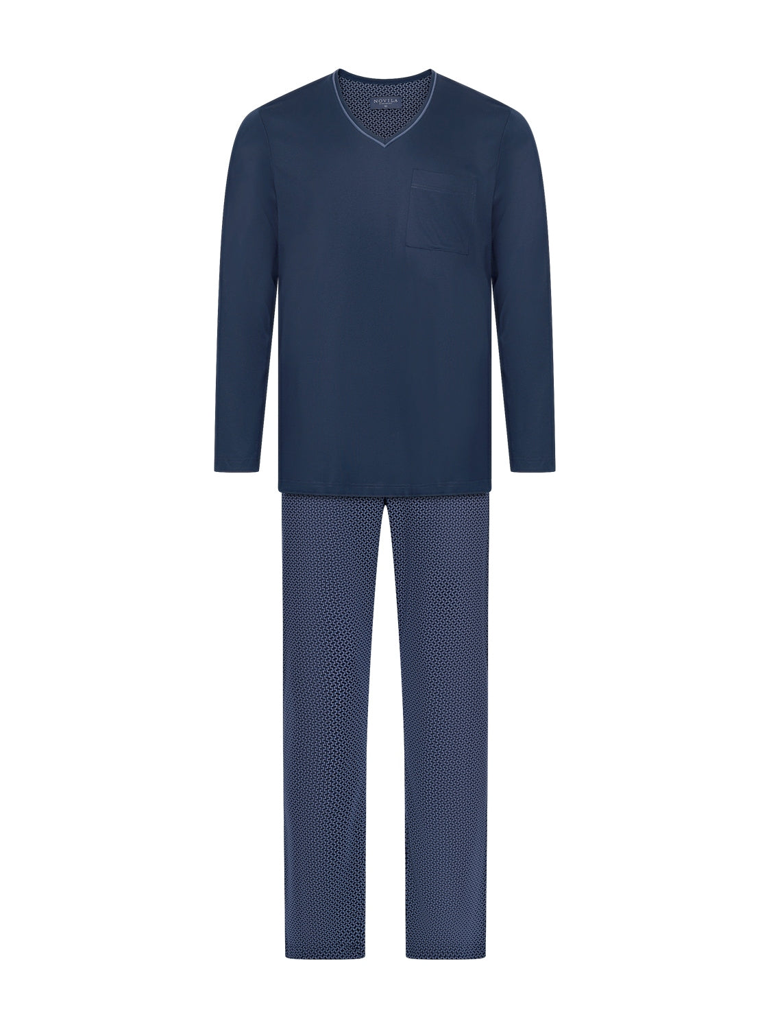 Der Pyjama Jan von Novila präsentiert sich in edlem Feininterlock-Jersey aus 100 % merzerisierter Baumwolle. Dieses hochwertige Material überzeugt durch seine besondere Geschmeidigkeit, Leichtigkeit und einen dezenten, edlen Glanz, der für ein angenehm weiches Hautgefühl sorgt. Das Oberteil in Uni-Optik zeigt sich mit einem paspelierten V-Ausschnitt und einer aufgesetzten Brusttasche, während der gerade Schnitt und die sorgfältige Verarbeitung an den Kanten besten Tragekomfort bieten. Die gemusterte Hose im exklusiven Design mit elastischem Bund ergänzt das Ensemble und verleiht dem Pyjama einen stilvollen, harmonischen Look.