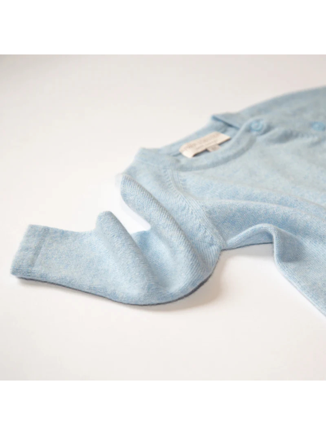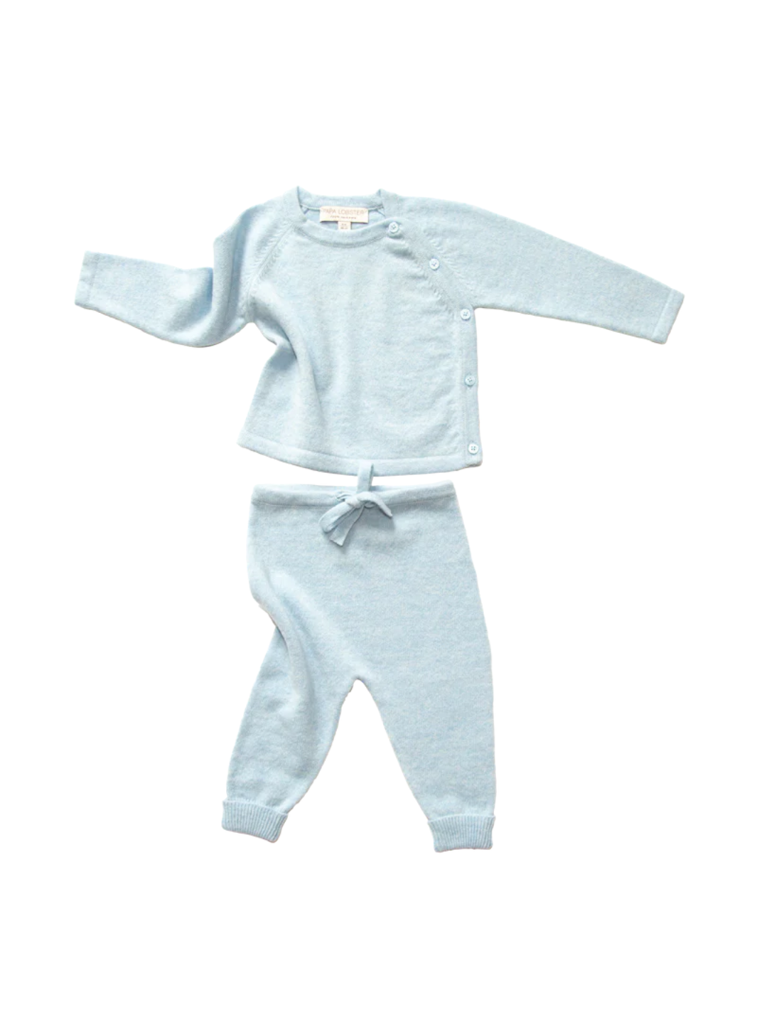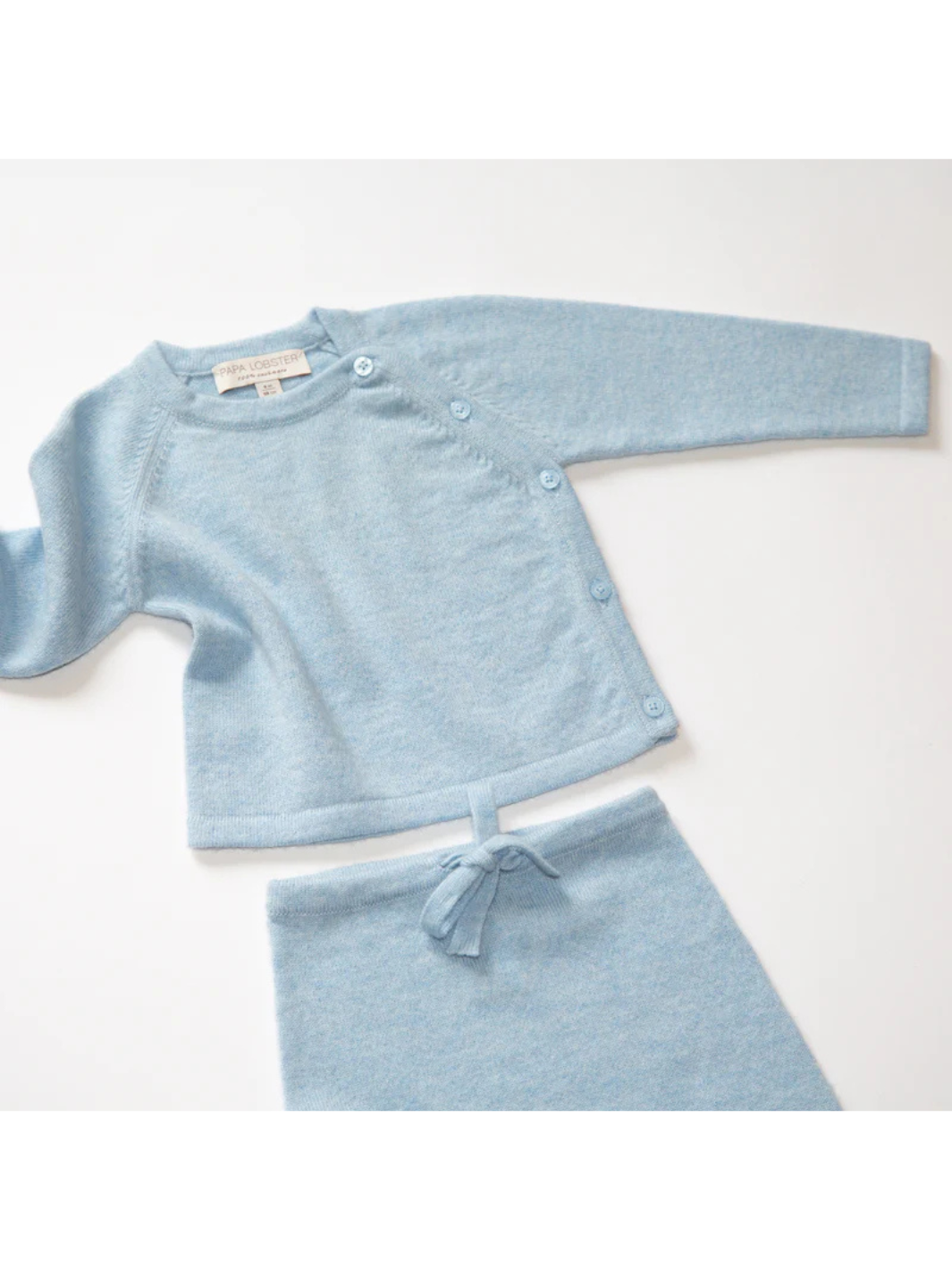 Das 2-fädige Babyset NIKA von Papa Lobster in Hellblau Mélange besteht aus einem Oberteil mit passender Hose und wird aus reinem Kaschmir gefertigt. Kaschmir trägt sich besonders weich auf der zarten Babyhaut. Dank der praktischen Knöpfe entlang der Raglan-Leiste gelingt das An- und Ausziehen besonders leicht.