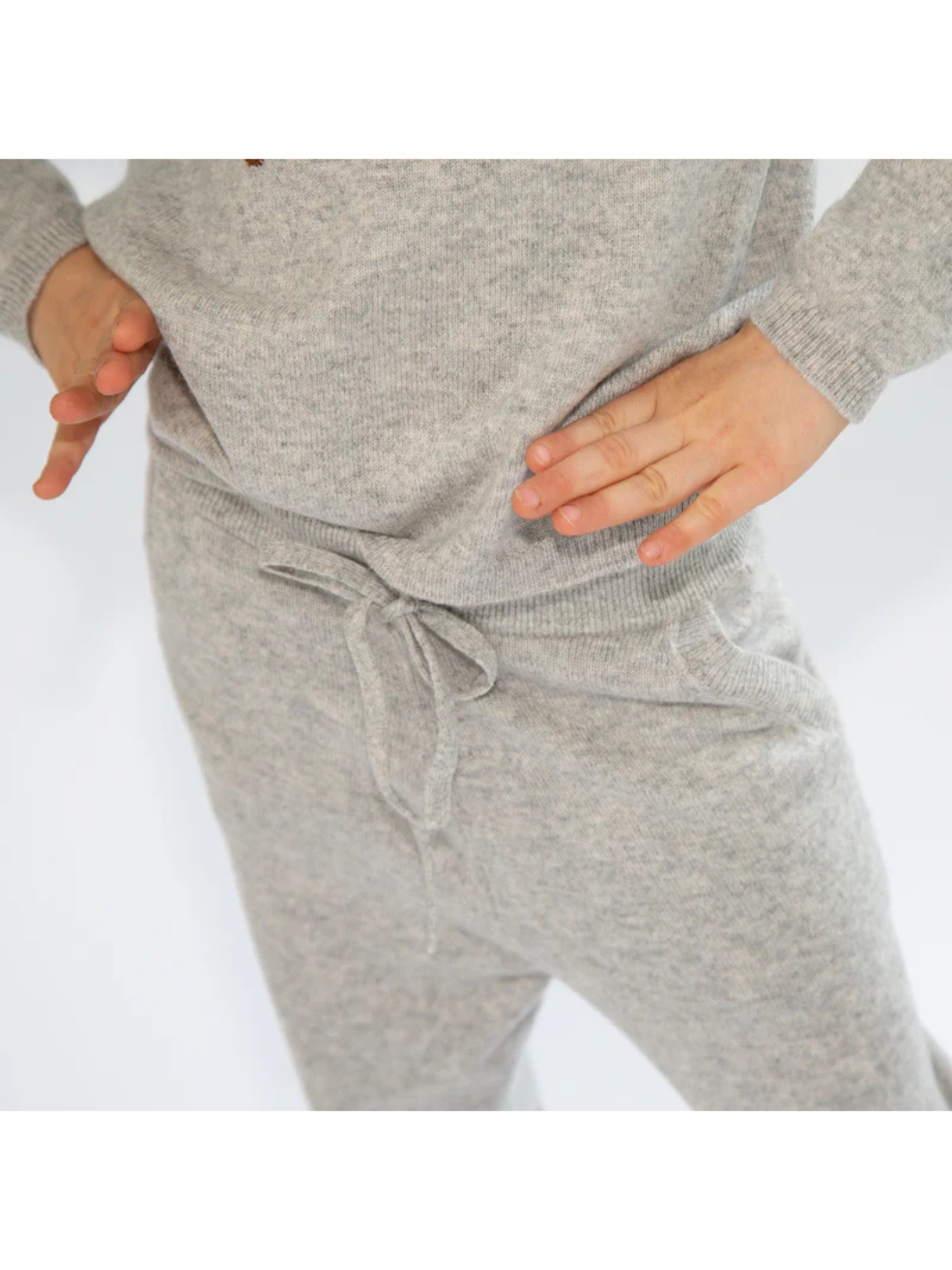 Die Hose CHARLIE in Hellgrau Mélange von Papa Lobster besteht aus reinem Kaschmir und überzeugt durch ihren Casual Look sowie eine relaxte Passform, perfekt für Kinder, die höchsten Komfort genießen möchten. Gefertigt aus flauschigem, 2-fädigem Rechts/Links-Strick (12 Gauge), spendet sie ein unglaublich weiches Tragegefühl.