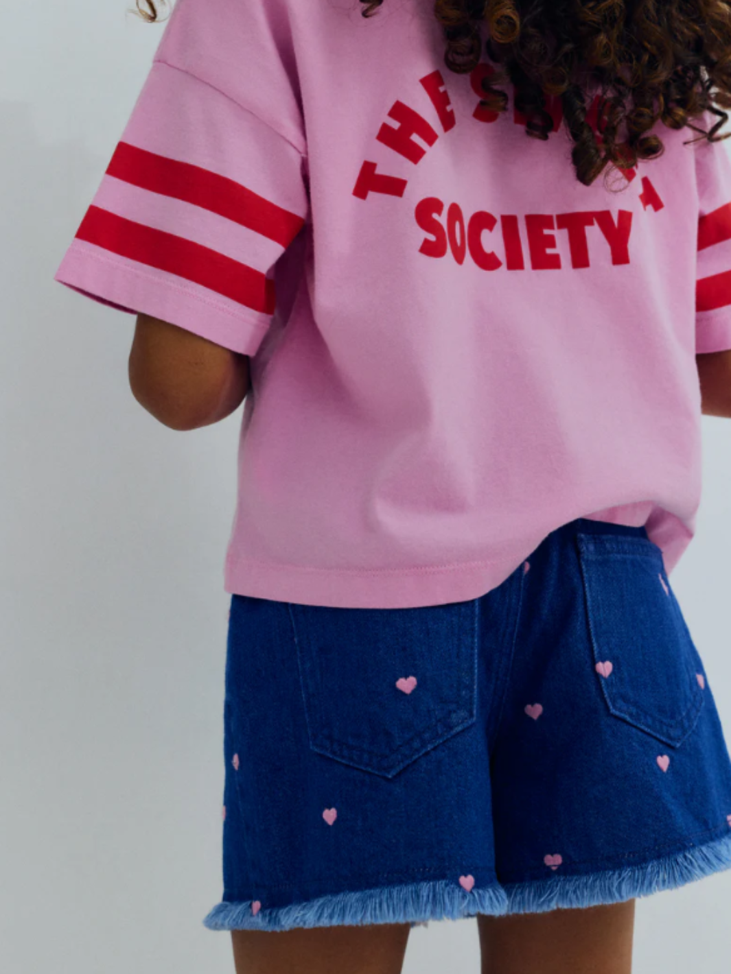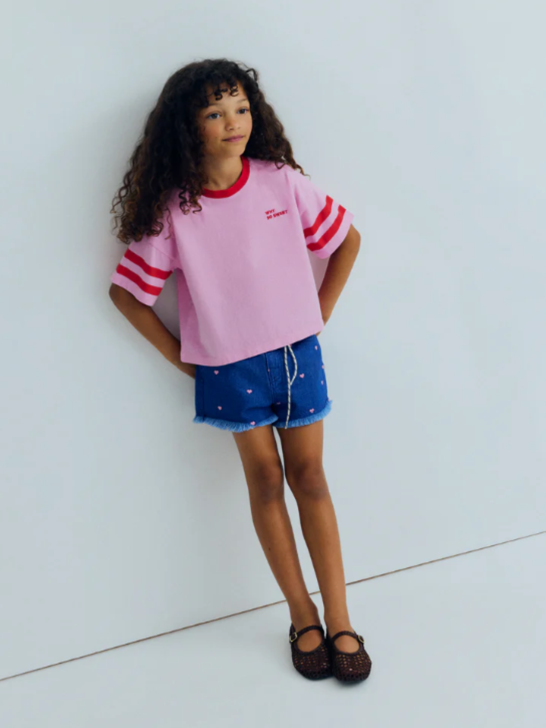Die Denim-Shorts aus weicher Baumwolle mit hübscher Herzstickerei sind unwiderstehlich. Die niedliche Stickerei verleiht dieser kurzen Jeanshose einen verspielten Touch. Mit praktischen Taschen vorn und hinten sowie einer bequemen Passform sind diese Shorts ein perfektes Kleidungsstück für warme Sommertage und einen lässigen Alltagslook.