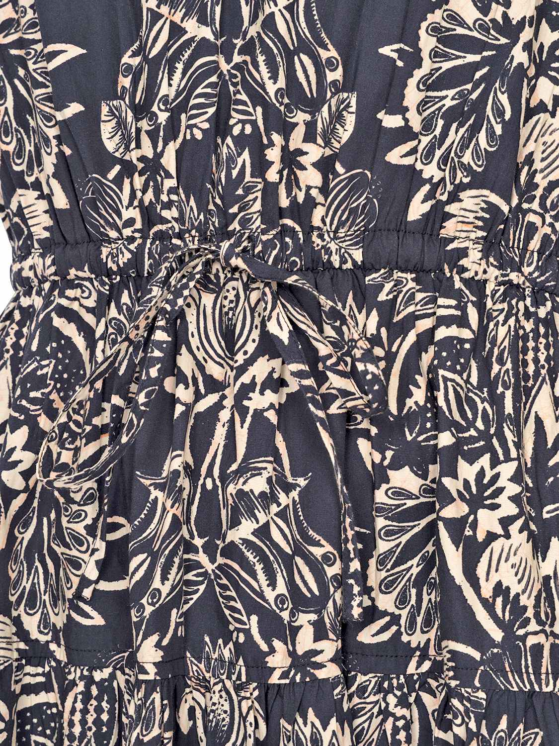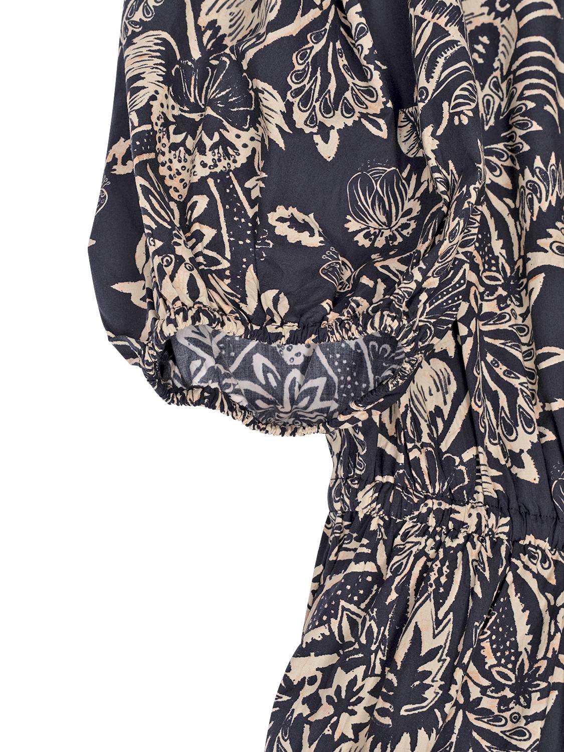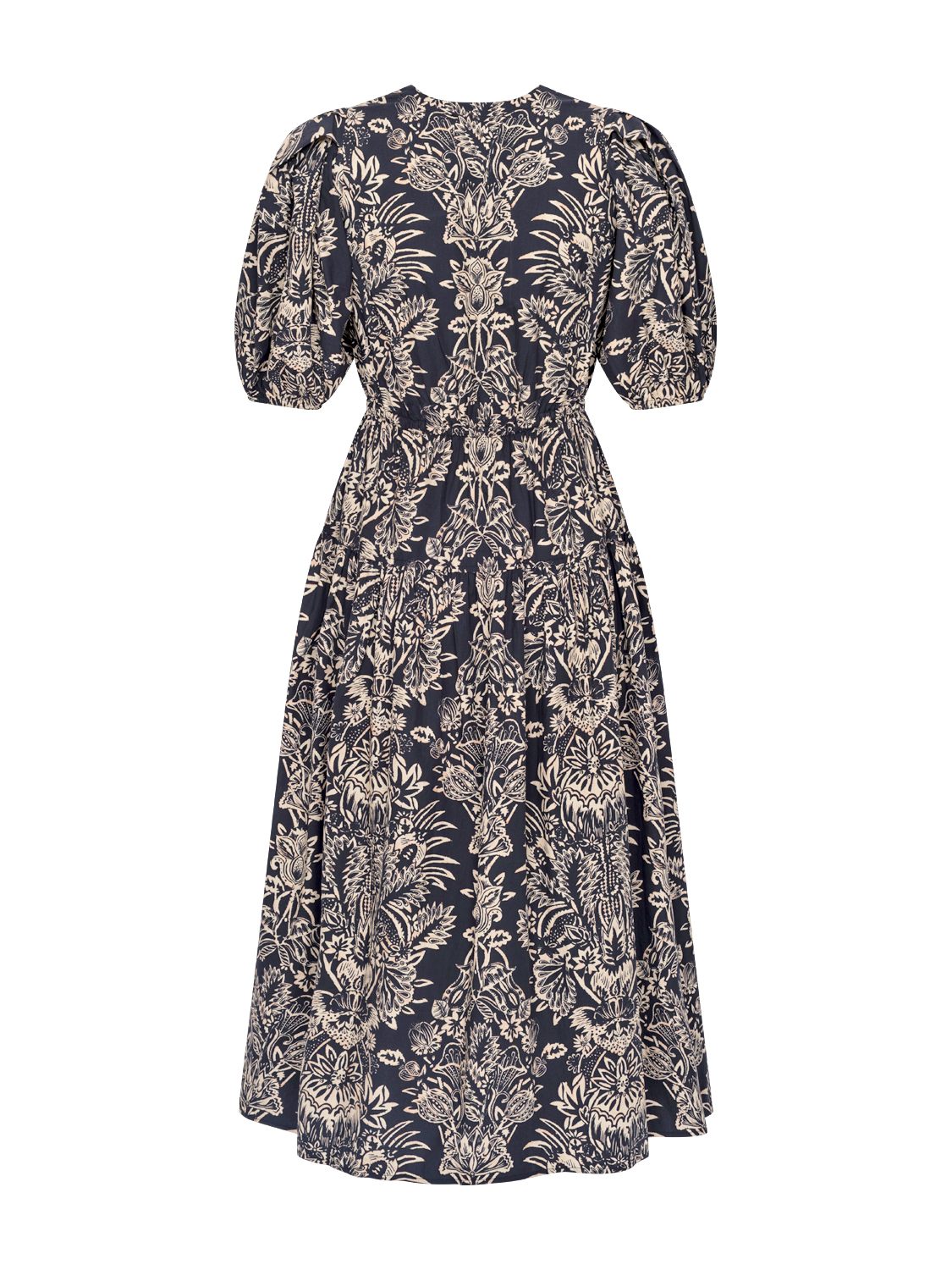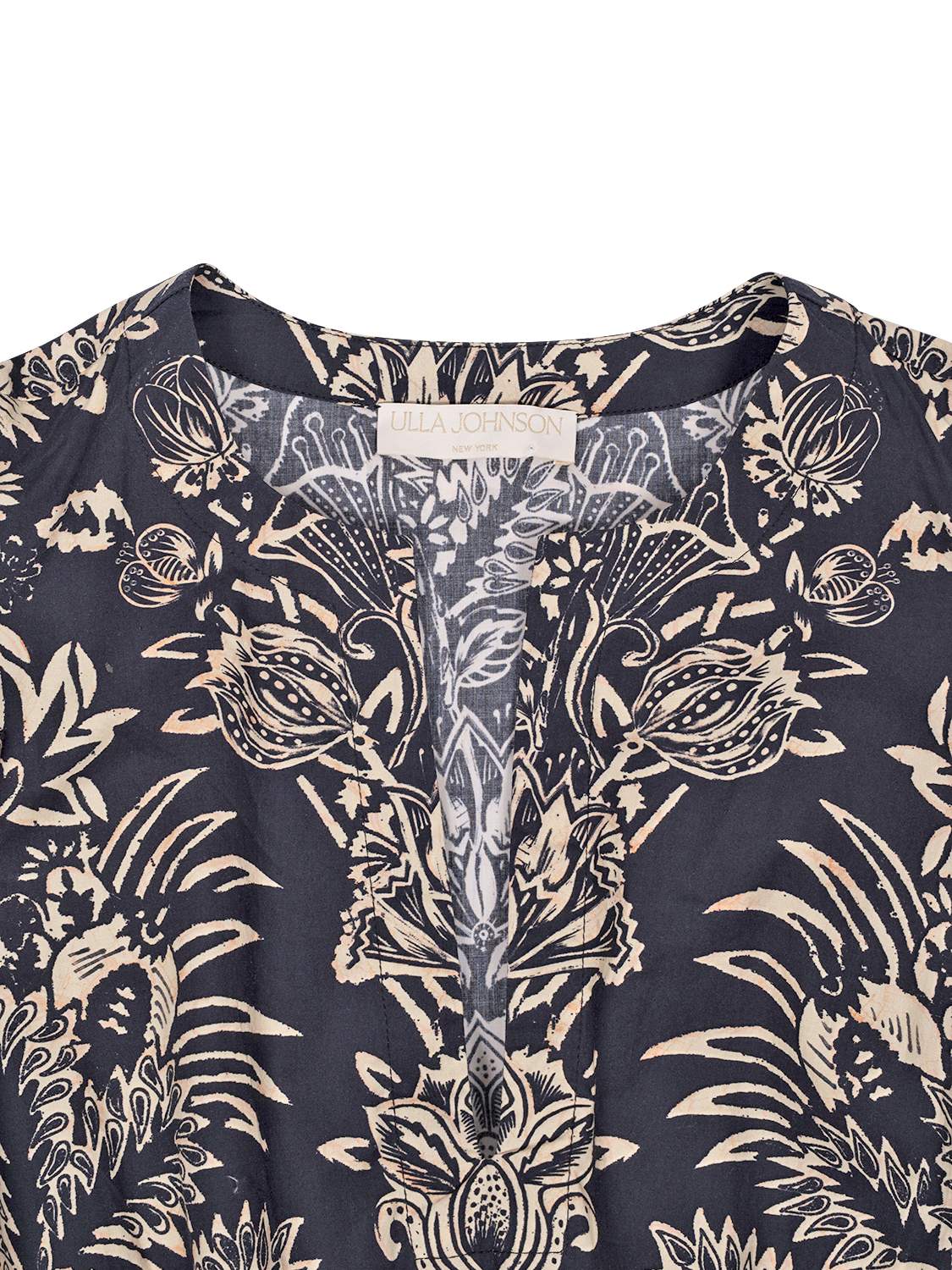 Das Harriet Dress fasziniert mit einem präzise angeordneten, grafischen Blattmotiv, das durch subtile Batiknuancen an Tiefe gewinnt. Der in Ivory und Schwarz gehaltene Popeline-Stoff bildet die Basis für eine charakteristische Ulla-Johnson-Silhouette: voluminiert gearbeitete, kunstvoll gelegte Ärmel, eine sanft betonte Taille und ein weich auslaufender Saum, der bei jeder Bewegung eine elegante Leichtigkeit vermittelt. Ein raffiniert gestaltetes Kleid, das moderne Ausdruckskraft mit femininer Linienführung harmonisch verbindet.