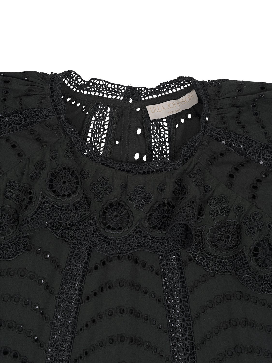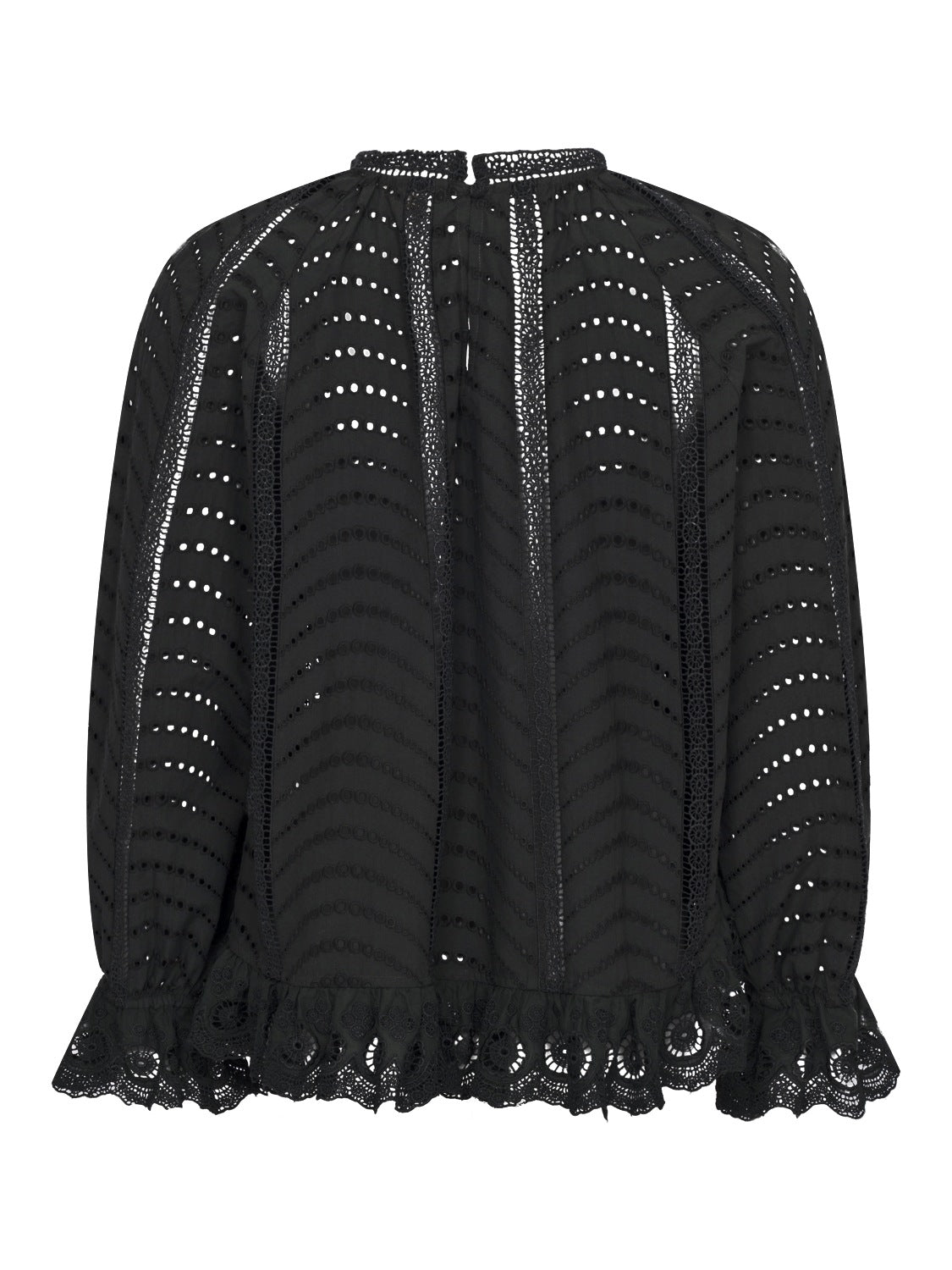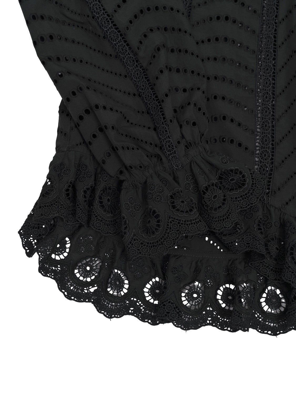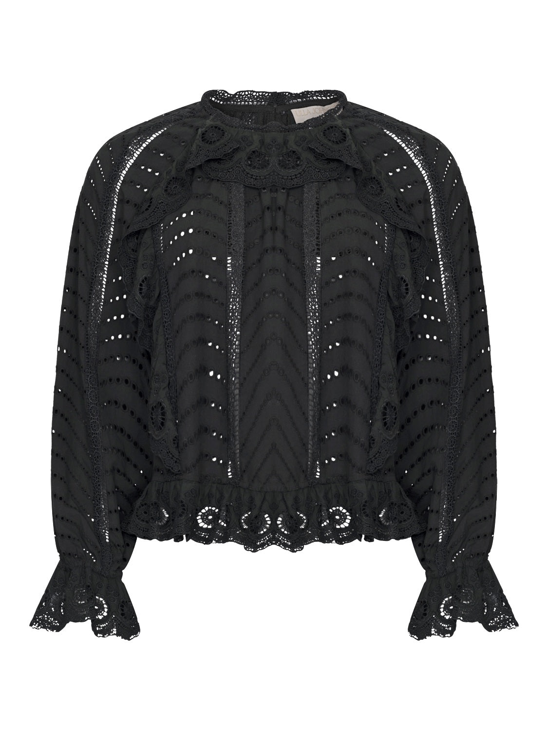Die Marcella Bluse besticht durch ihren charakteristischen, wassergewaschenen Popelin-Stoff und wurde mit zarten, wellenförmigen Degradé-Ösen sowie feinen Spitzenbesätzen veredelt, die auf subtile Weise Haut durchscheinen lassen. Verspielte, geschwungene Volants verleihen dem weißen Modell eine feminine und leichte Ausstrahlung. Diese besondere Bluse eignet sich perfekt, um handgefertigte Denim-Looks zu veredeln und ihnen einen eleganten, zugleich verspielten Akzent zu geben.