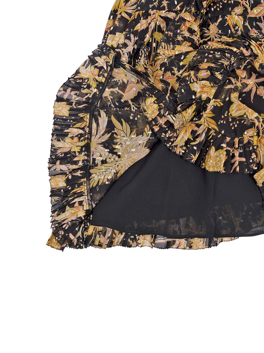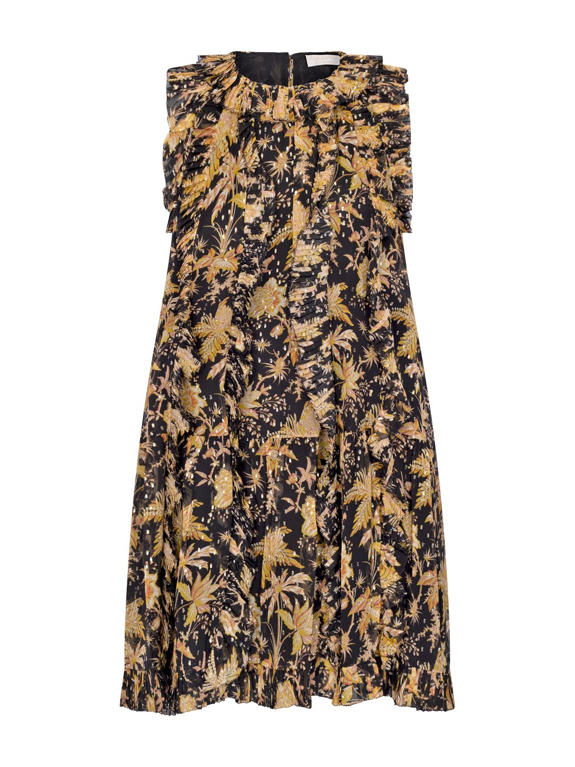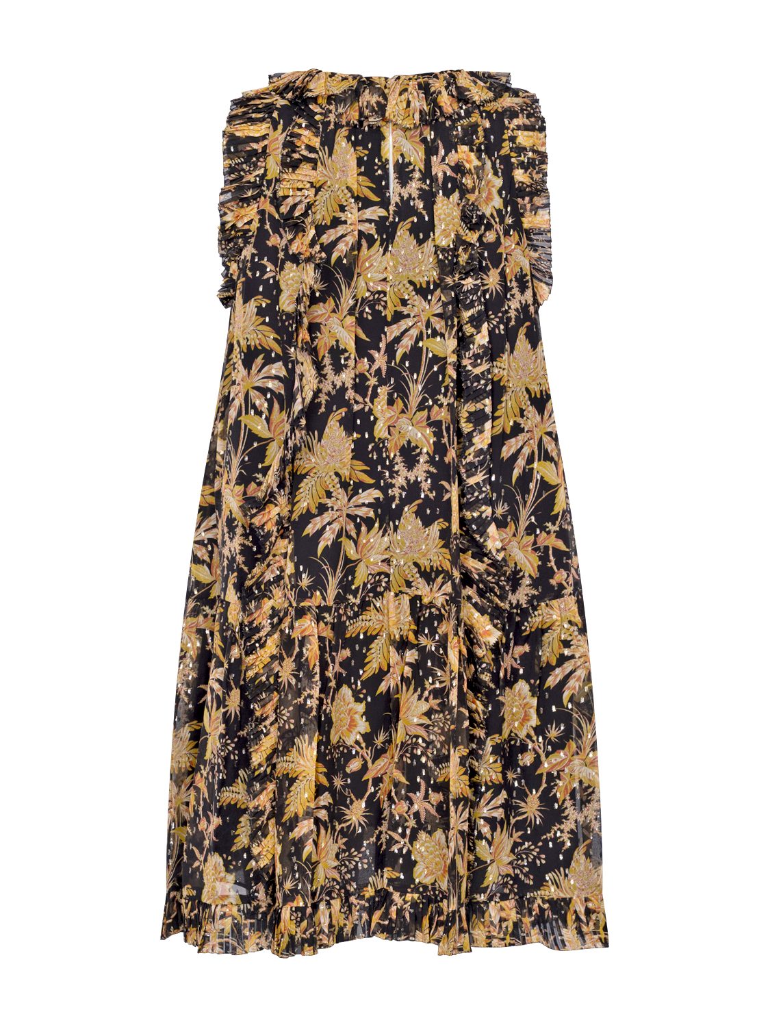 The Signe Dress zeigt sich in einer zarten, bewegten Silhouette, die durch den leichten Chiffon eine wunderbar luftige Wirkung erhält. Metallisch schimmernde Punkte, florale Elemente und feine, plissierte Rüschen verleihen dem Modell eine detailreiche, romantische Note. Die mehrfarbige Gestaltung unterstreicht den verspielten Charakter des Kleides, während die Babydoll-Silhouette mit ihrem weich fallenden Volumen eine feminine und zugleich moderne Ausstrahlung schafft. Ein Kleid, das Leichtigkeit, Charme und kunstvolle Verzierungen harmonisch miteinander verbindet.