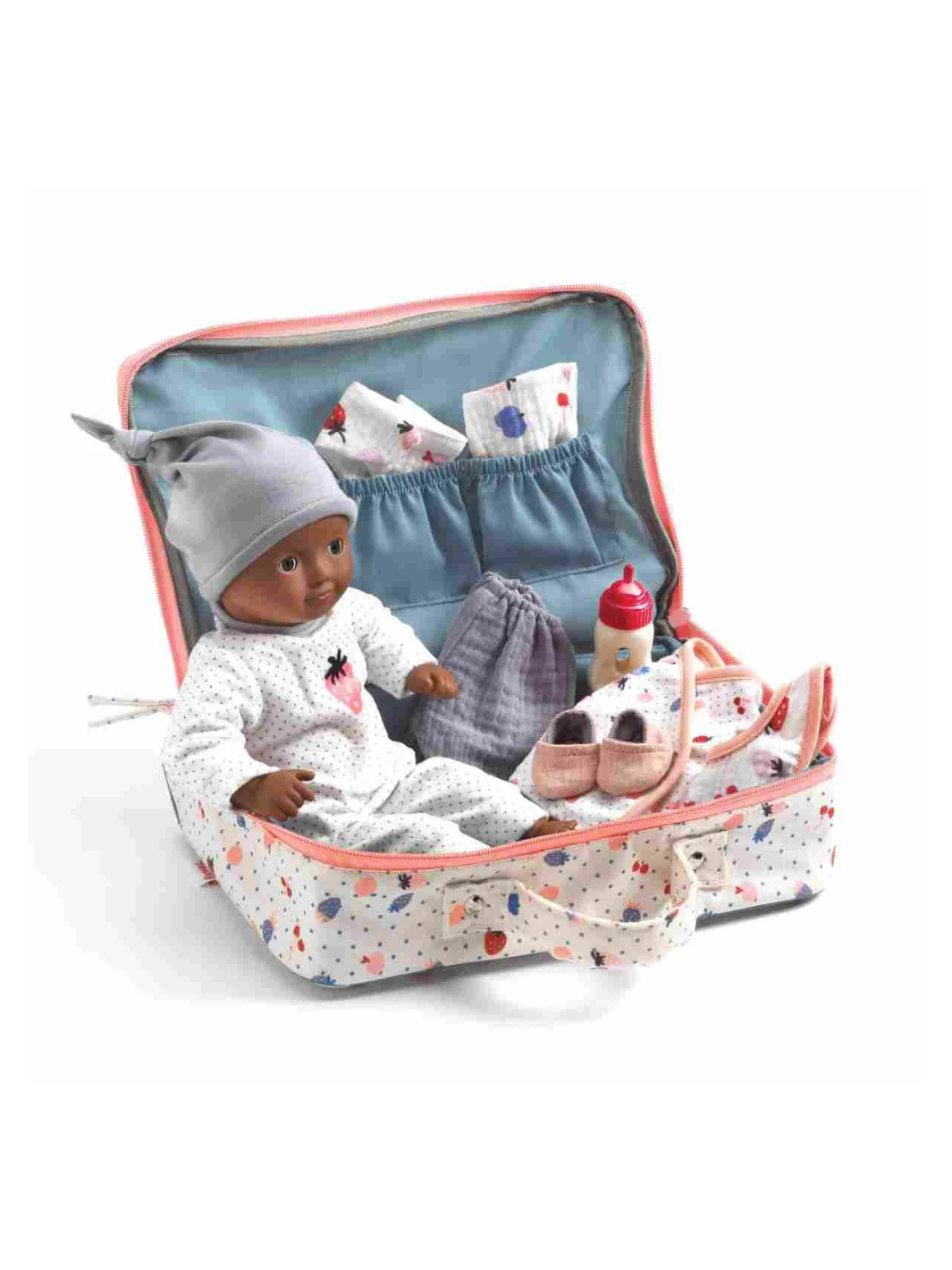 info@djeco.com- Lieferumfang: 1 Koffer, 1 32-cm-Puppe (weicher Stoffkörper und -kopf, Arme und Beine aus Vinyl), 1 Schlafanzug, 1 Mütze, 1 Wickeltop, 1 Bloomer, 1 Paar Hausschuhe, 1 Windel, 1 Tüchlein, 1 Babyflasche, 1 Lätzchen.