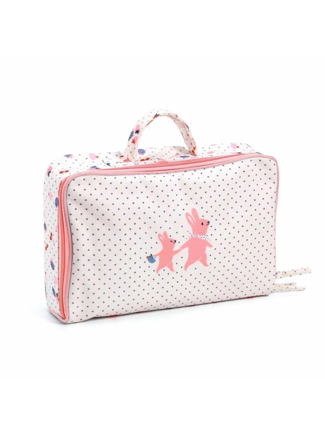 Dieser liebevoll gestaltete Koffer enthält alles, was eine angehende Puppen-Mama benötigt, um sorgenfrei auf Reisen zu gehen. Im Koffer befinden sich neben dem Baby Cerise ein Schlafanzug samt Mütze, Klamotten zum Wechseln, eine Windel, eine Babyflasche sowie ein Lätzchen.