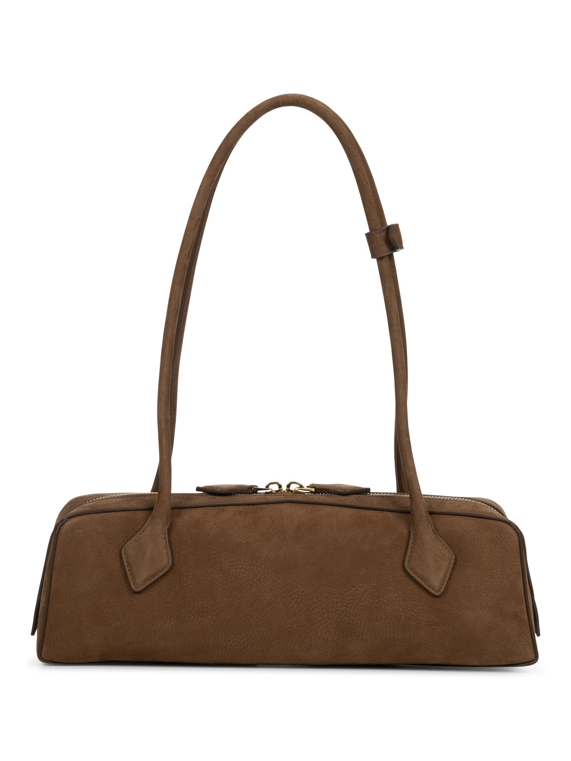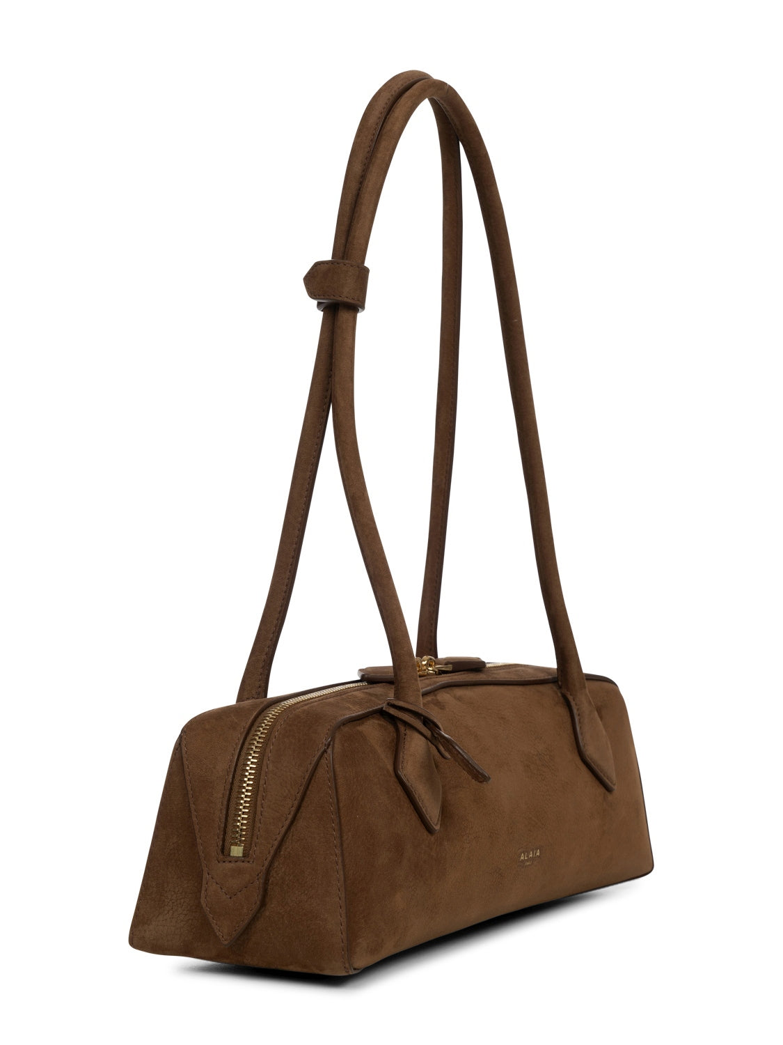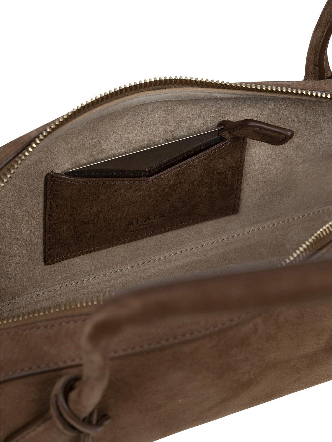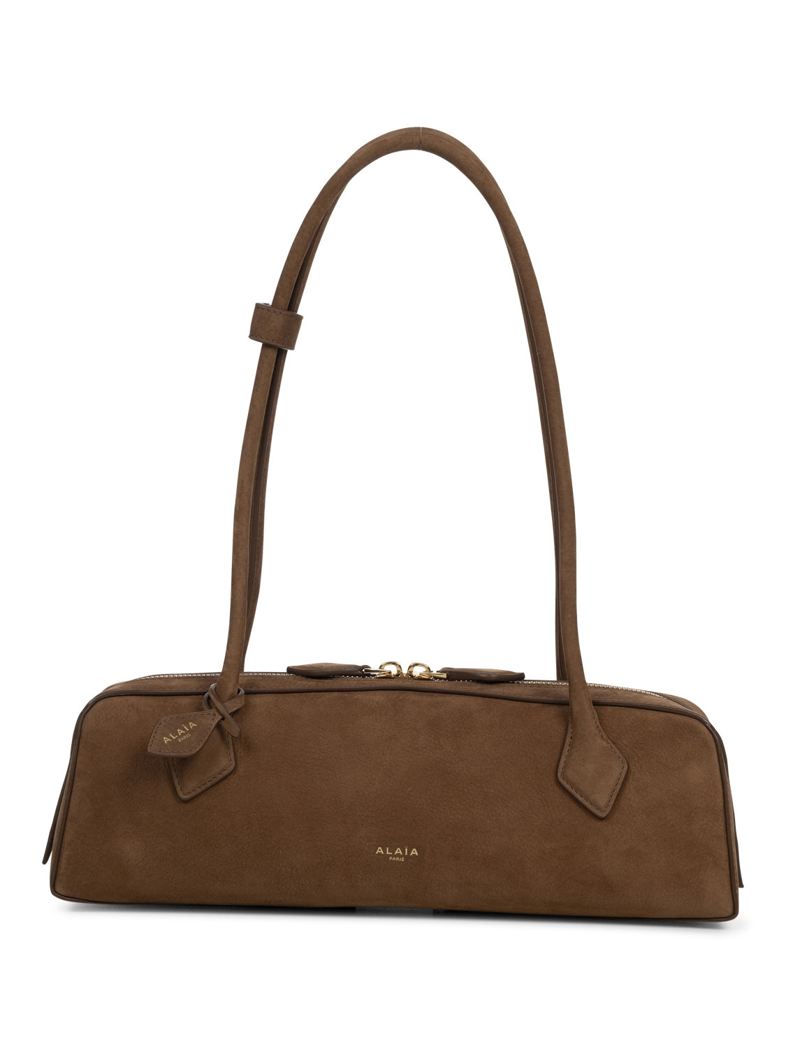 Die braune Tasche von Alaïa ist aus Kalbsleder gefertigt. Sie hat einen doppelten Reißverschluss und röhrenförmige Henkel, die sich perfekt über der Schulter tragen lassen. Im Inneren der Tasche befindet sich ein kleiner, abnehmbarer Spiegel. Perfekt für den Abend oder den Alltag.