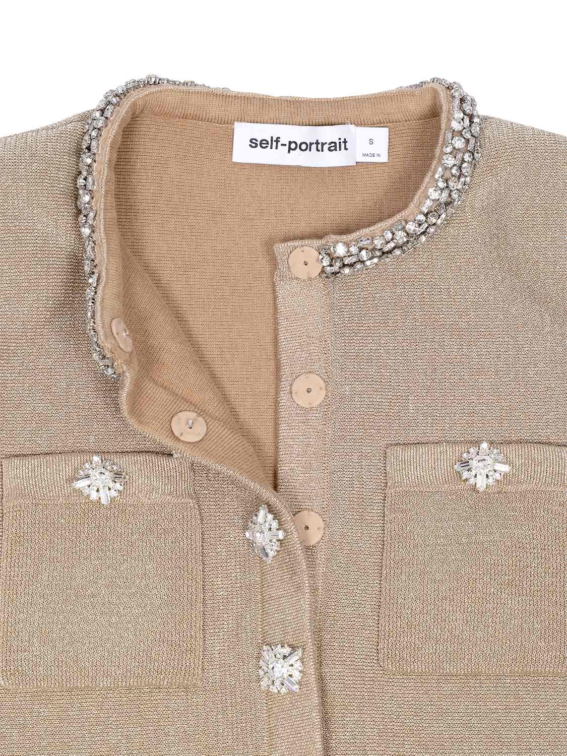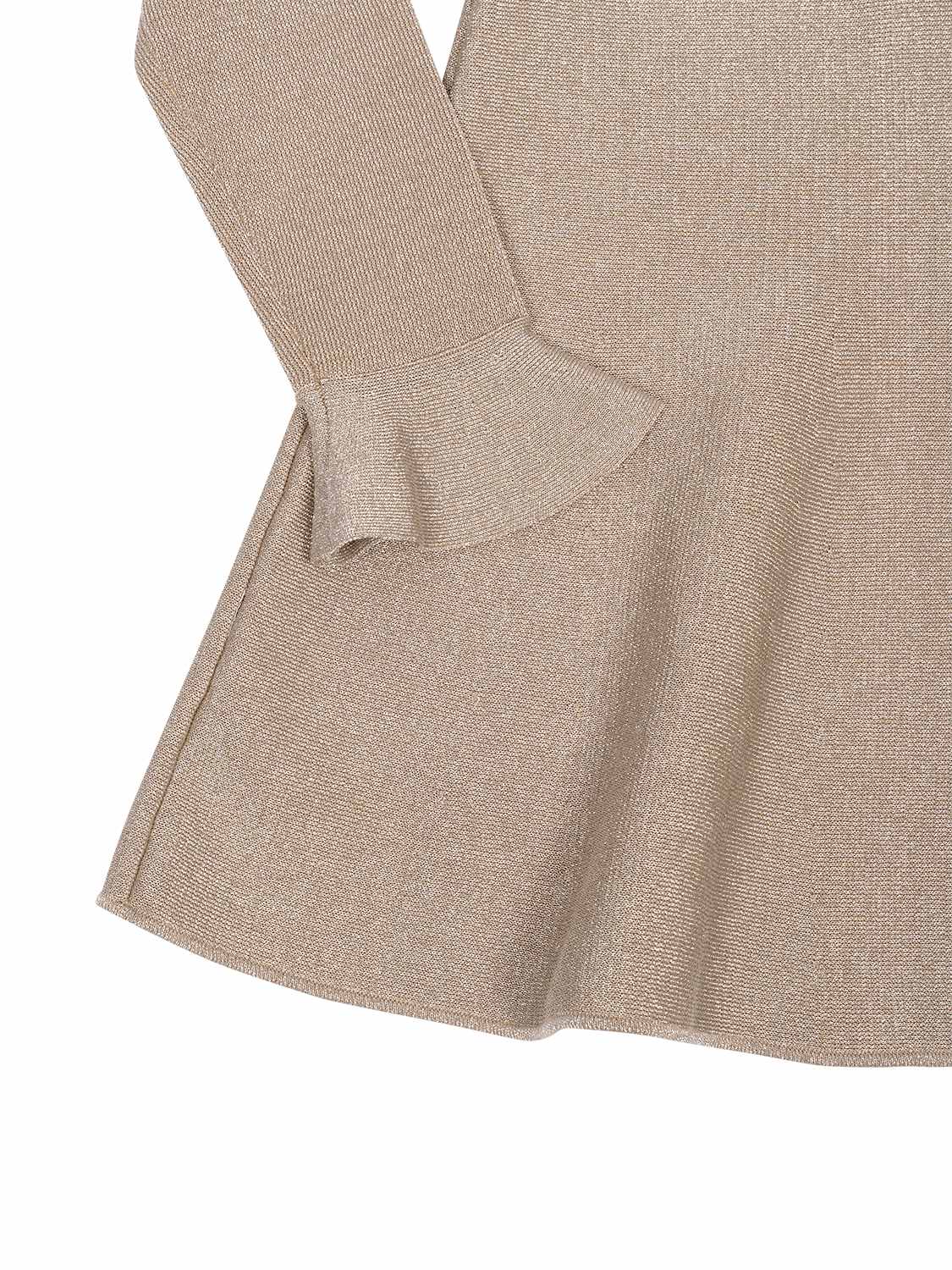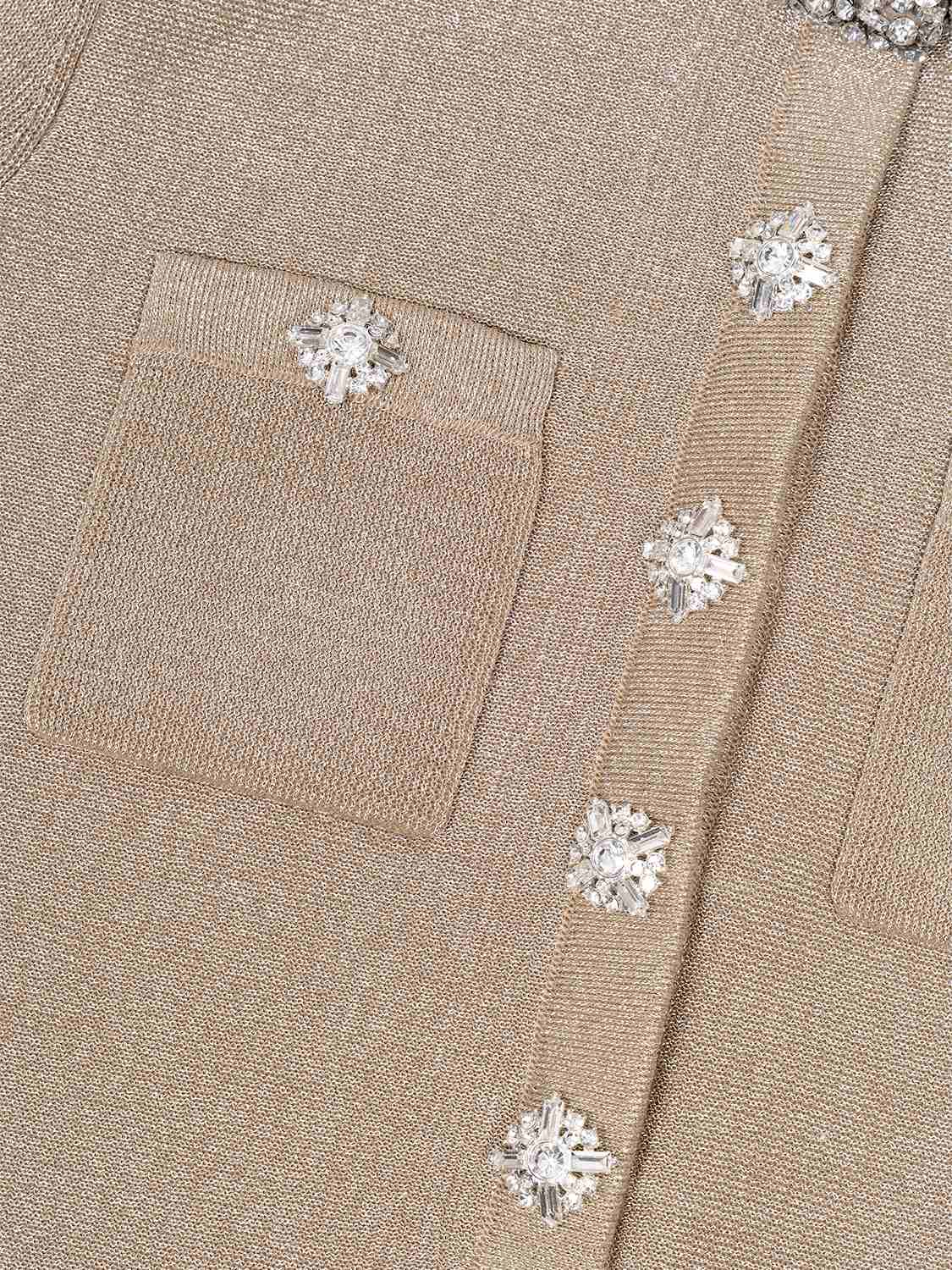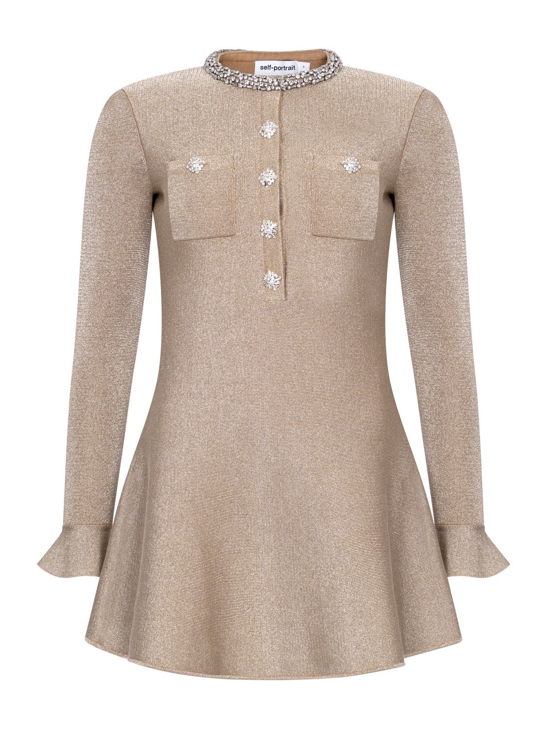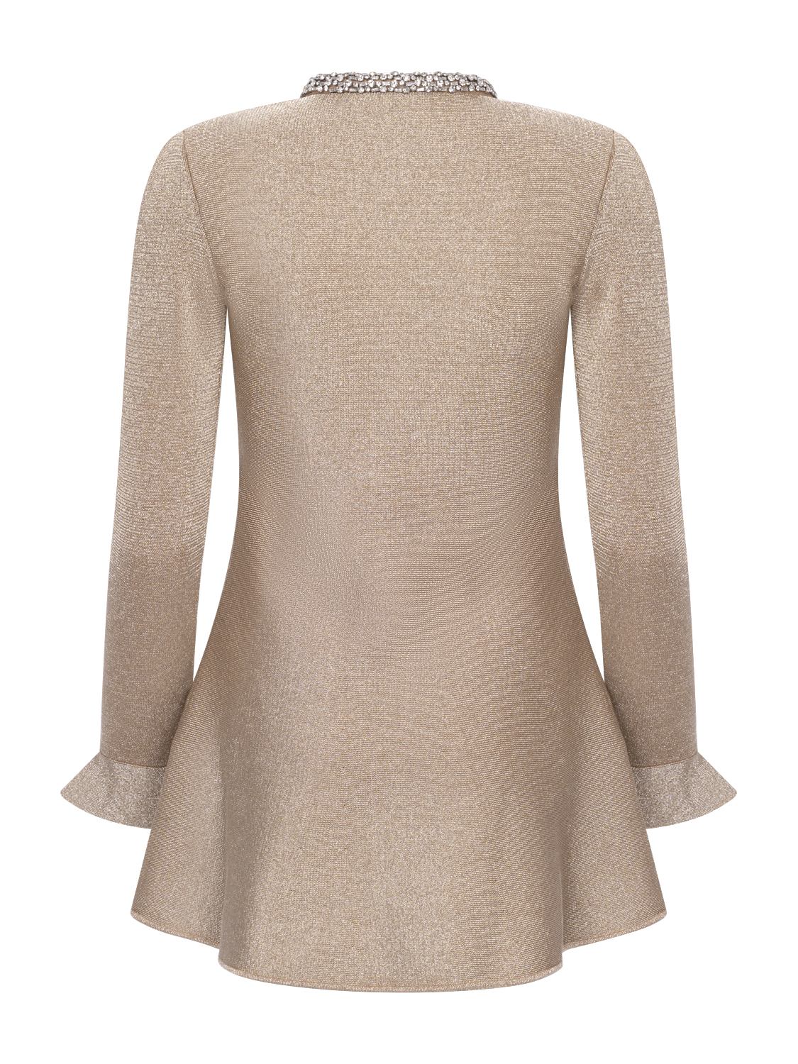Dieses Metallic-Strickkleid verkörpert puren Glamour und zieht mit seinem funkelnden Auftritt alle Blicke auf sich. Kristallbesätze setzen glitzernde Highlights und verleihen dem Modell zusätzlichen dramatischen Flair, während Schulterpolster die elegante Silhouette wirkungsvoll betonen. Der figurbetonte Schnitt mit ausgestelltem Mini-Rock schafft eine feminine, dynamische Linie, die perfekt für festliche Anlässe oder glamouröse Partys geeignet ist. In Kombination mit hohen Schuhen wird das Kleid zum stilvollen Statement-Piece, das sowohl Eleganz als auch selbstbewusste Ausstrahlung verkörpert.