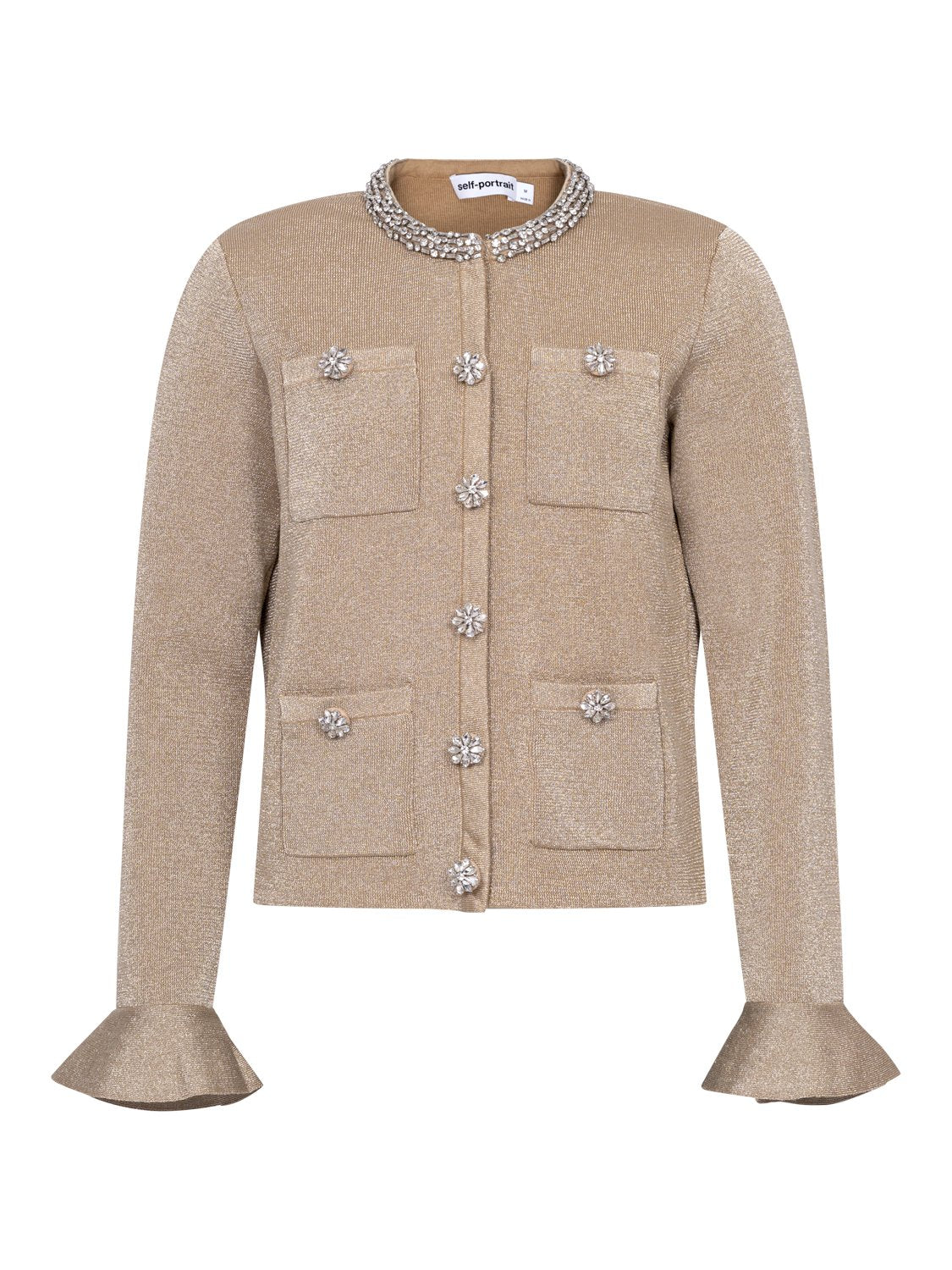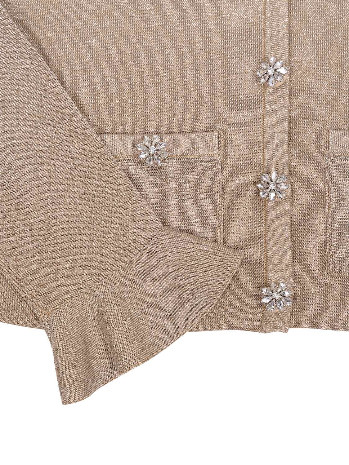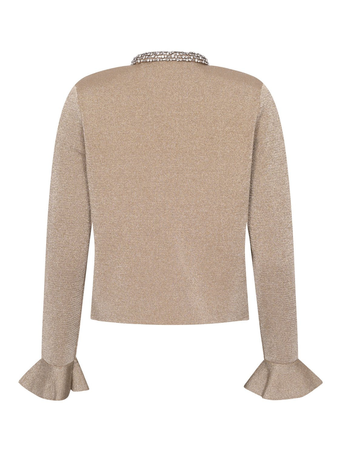 Dieses Cardigan aus goldfarbenem Metallic-Strick bringt jeden Look zum Glänzen und setzt glamouröse Akzente. Die leicht ausgestellten Ärmel und funkelnden Details sorgen für zusätzlichen Dramaeffekt und verleihen dem Modell eine elegante, auffällige Ausstrahlung. Besonders stilvoll wirkt das Cardigan in Kombination mit Jeans, wodurch ein moderner High-Low-Look entsteht, der mühelos Lässigkeit und luxuriösen Glanz miteinander vereint.
