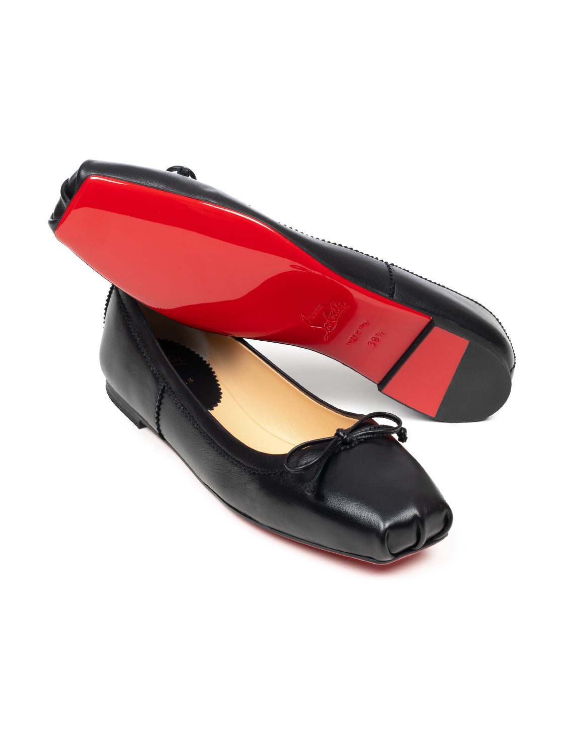 Der schwarze Ballerina Mamadrague aus edlem Lamm-Nappaleder überzeugt durch seine besonders weiche, anschmiegsame Haptik und eine elegante, puristische Ausstrahlung. Die aufwendige Sacchetto-Verarbeitung sorgt dafür, dass sich der Schuh flexibel an den Fuß anpasst und ein außergewöhnlich angenehmes Tragegefühl bietet. Charakteristisch ist die moderne, eckige Spitze, die durch eine feine Schleife auf der Vorderseite stilvoll ergänzt wird und dem Design eine feminine Leichtigkeit verleiht. Dezente Ziernähte betonen die klaren Linien des flachen Modells und unterstreichen seine hochwertige Verarbeitung. Abgerundet wird der Ballerina durch die innovative „Everlasting Red“-Sohle, die dank spezieller Beschichtung dauerhaft intensiv leuchtet und zugleich besonders widerstandsfähig ist – ein unverkennbares Markenzeichen von Christian Louboutin.