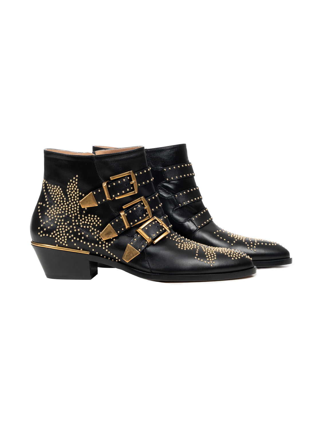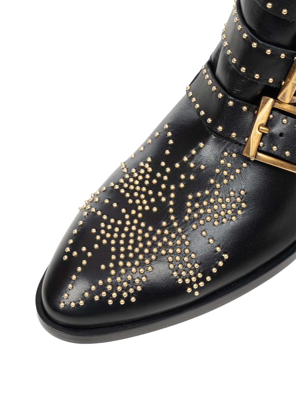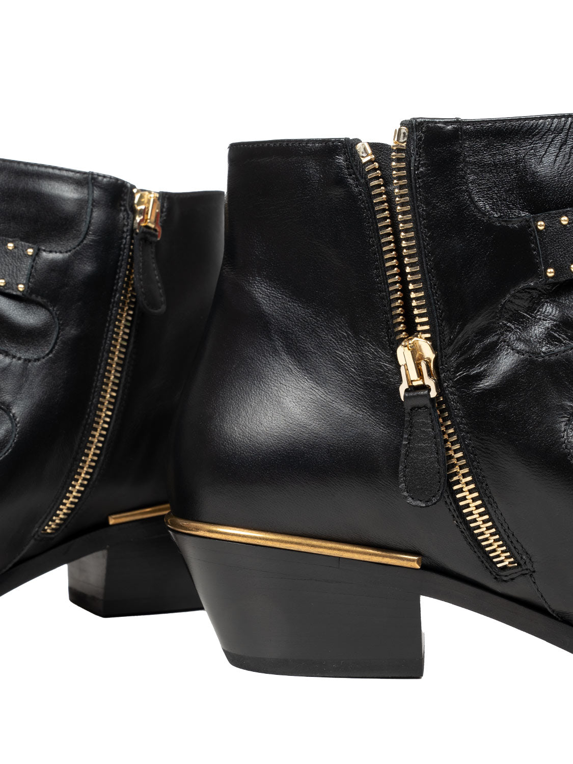 Die Susanna Stiefelette ist ein auffälliges Statement-Piece, das jedem Chloé Girl einen glamourös-rockigen Auftritt verleiht. Das geschmeidige Nappa-Schafleder mit glänzendem Finish strahlt feminine Eleganz aus und harmoniert perfekt mit den Vintage-Schnallen und kunstvoll platzierten Nieten, die dem Schuh seinen charaktervollen Glamour verleihen. Die verlängerte Zehenpartie, der kubanische Absatz und die markante, dicke Sohle erinnern an Cowboystiefel und verleihen der Stiefelette einen selbstbewussten, modernen Western-Touch, der Stilbewusstsein und Persönlichkeit stilvoll verbindet.