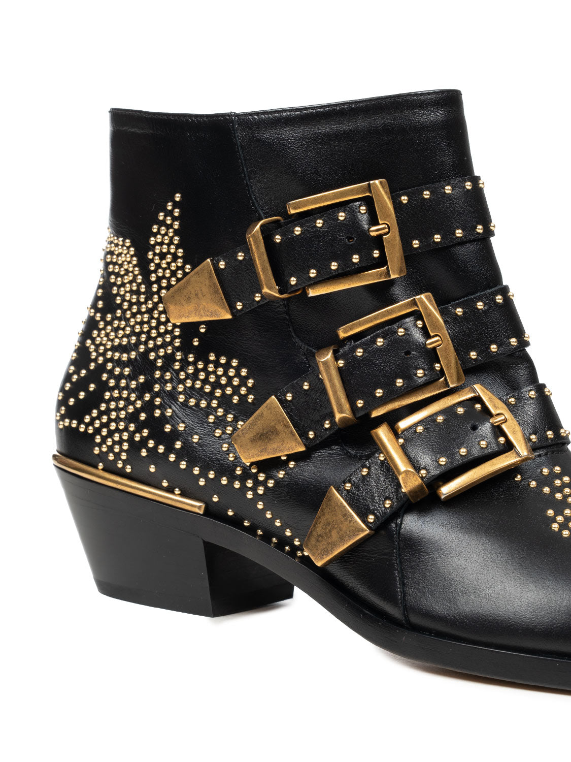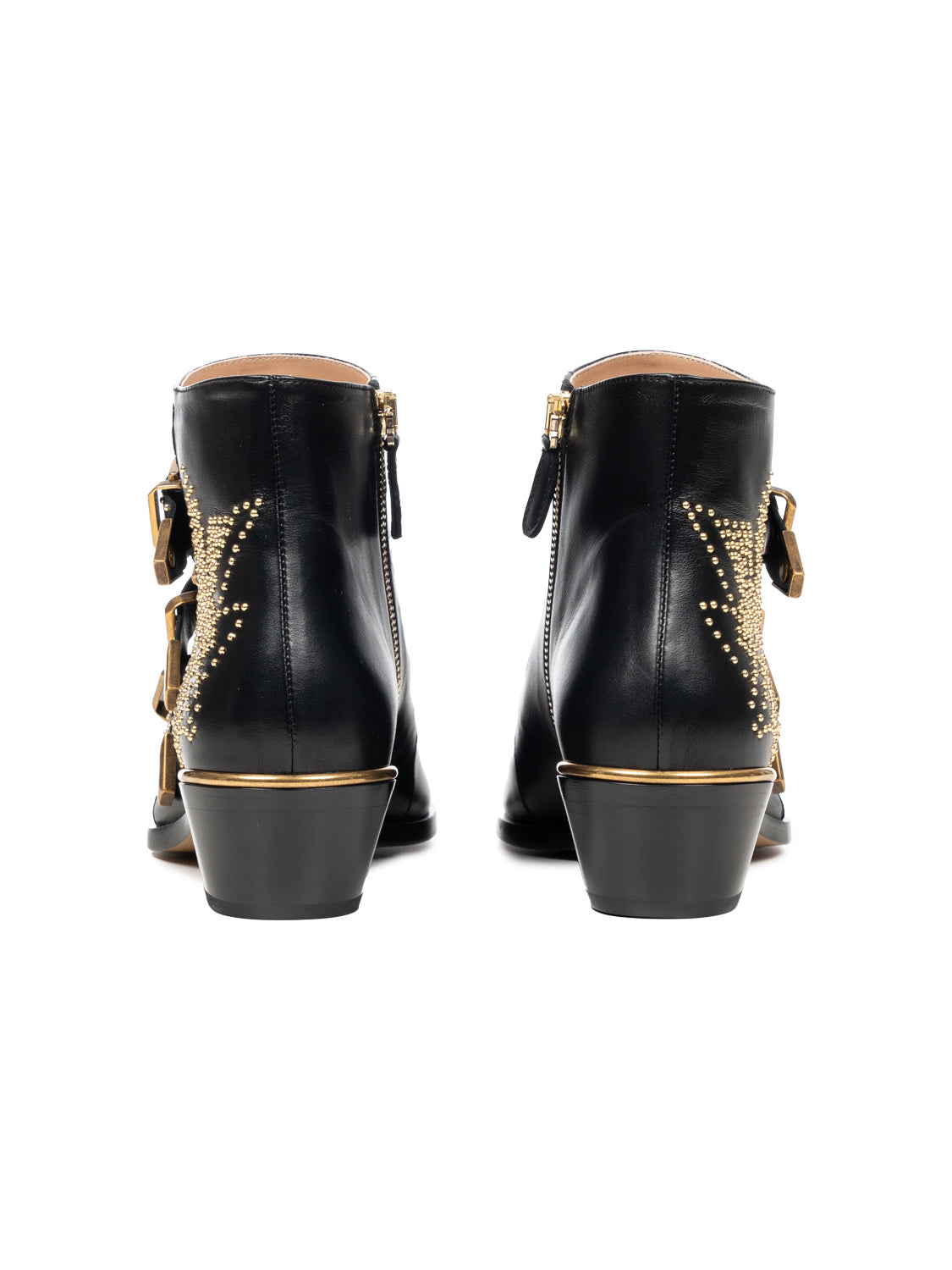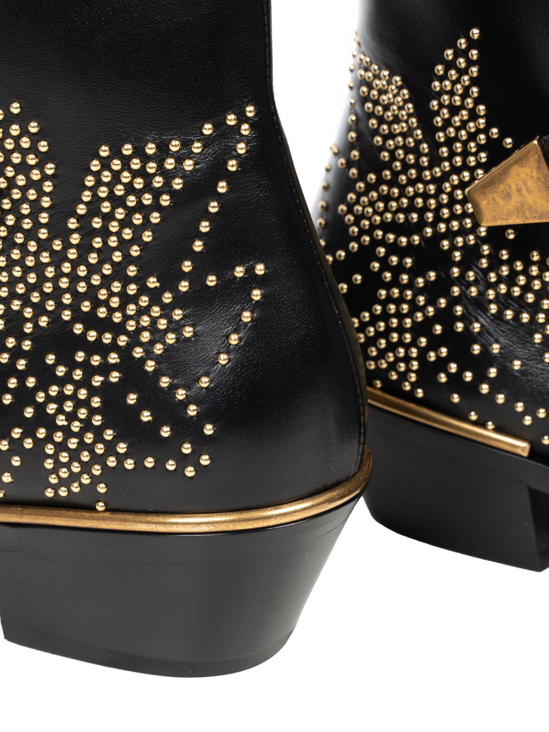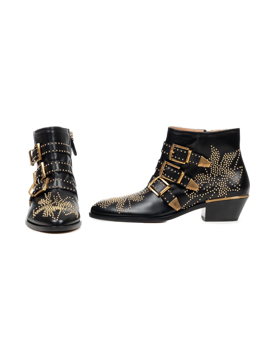 Die Susanna Stiefelette ist ein auffälliges Statement-Piece, das jedem Chloé Girl einen glamourös-rockigen Auftritt verleiht. Das geschmeidige Nappa-Schafleder mit glänzendem Finish strahlt feminine Eleganz aus und harmoniert perfekt mit den Vintage-Schnallen und kunstvoll platzierten Nieten, die dem Schuh seinen charaktervollen Glamour verleihen. Die verlängerte Zehenpartie, der kubanische Absatz und die markante, dicke Sohle erinnern an Cowboystiefel und verleihen der Stiefelette einen selbstbewussten, modernen Western-Touch, der Stilbewusstsein und Persönlichkeit stilvoll verbindet.