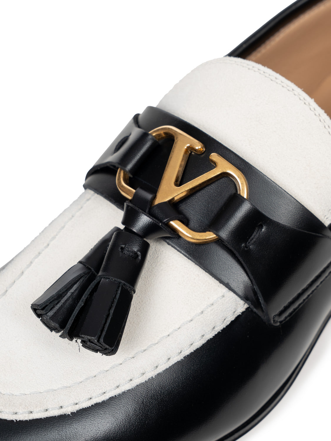 Die Vaniteux Bicolor-Loafer von Valentino Garavani verbinden auf elegante Weise zurückhaltenden Stil mit ikonischer Signatur. Das markante V-Logo auf dem Oberleder verkörpert die traditionsreiche Ästhetik des Hauses und setzt einen subtilen, zugleich unverkennbaren Akzent. Gefertigt aus hochwertigem Leder und veredelt mit filigranen Quasten-Details, überzeugen die Loafer durch exzellente Handwerkskunst, langlebige Qualität und zeitlose Raffinesse. Ein luxuriöses Schuhmodell, das klassischen Chic mit moderner Eleganz vereint und jedem Outfit einen stilvollen Abschluss verleiht.