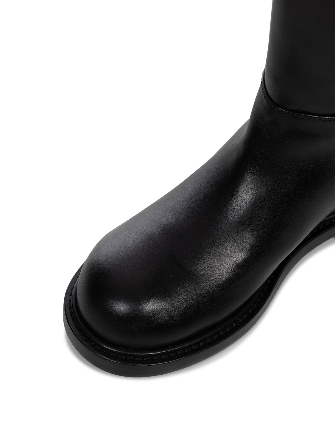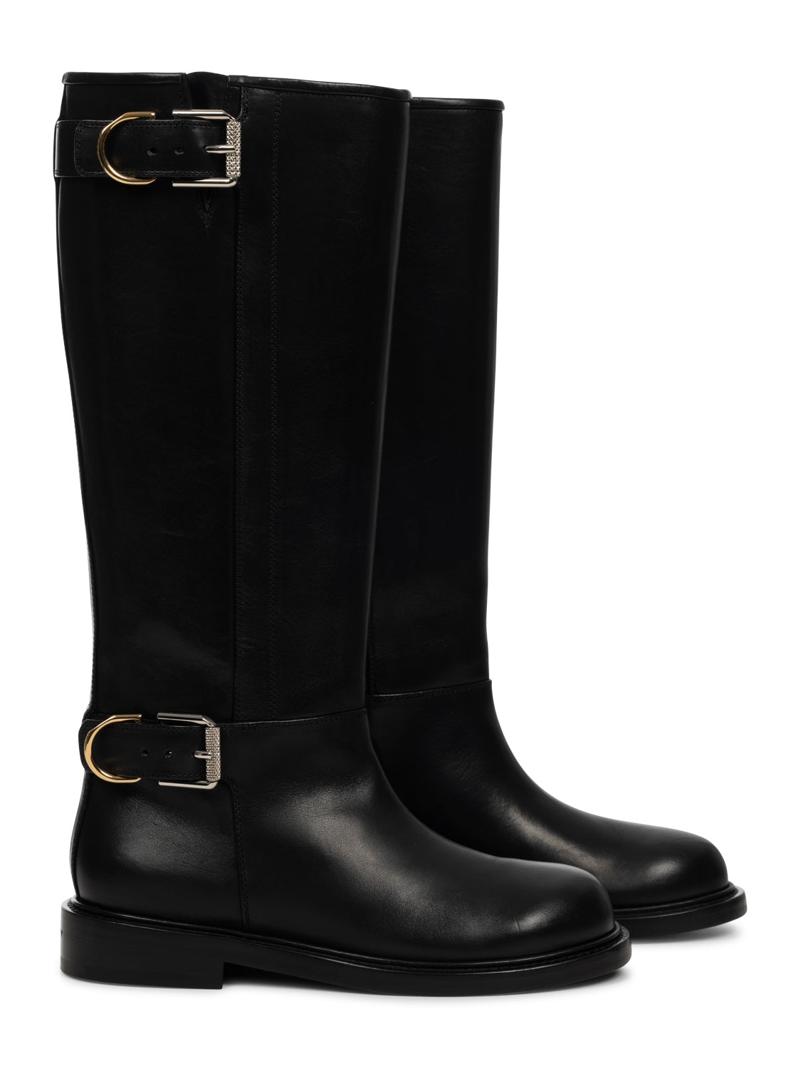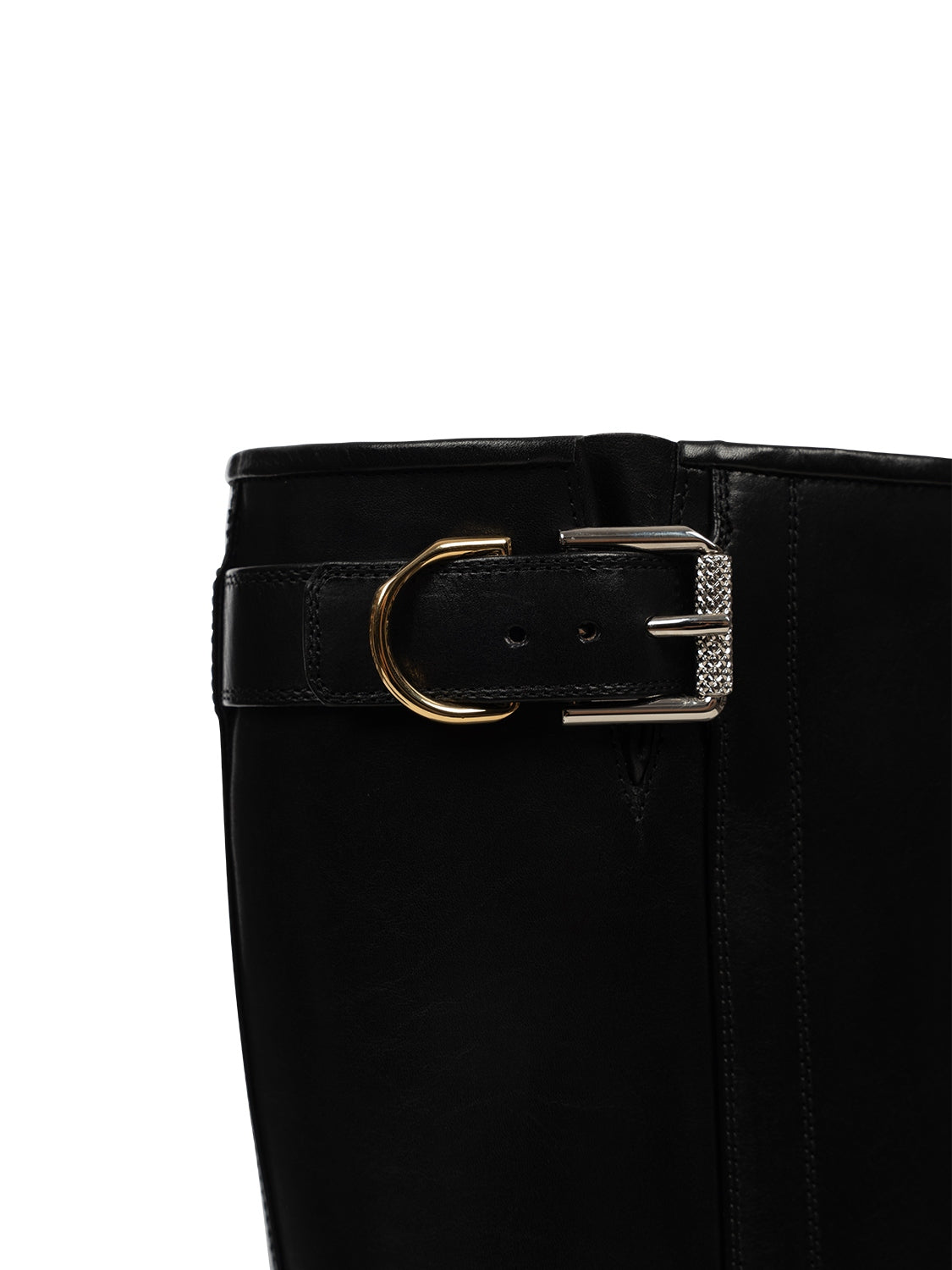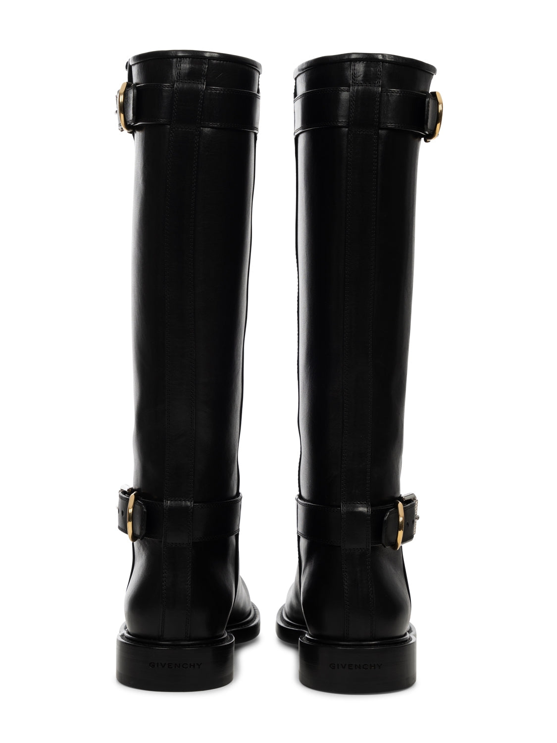Die kniehohen Stiefel von Givenchy sind aus hochwertigem schwarzem Kalbsleder gefertigt und an den Seiten mit edlen goldenen und silbernen Schnallen verziert. Sie sind vielseitig kombinierbar und passen sowohl zu eleganten Abendlooks als auch zu einem stillvollen Alltagsoutfit.