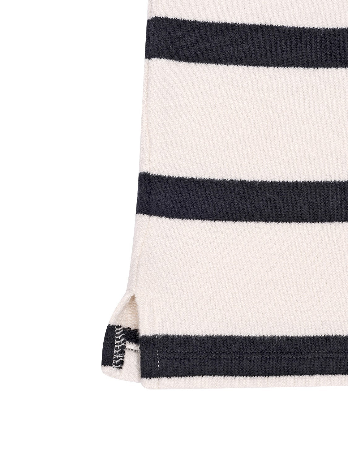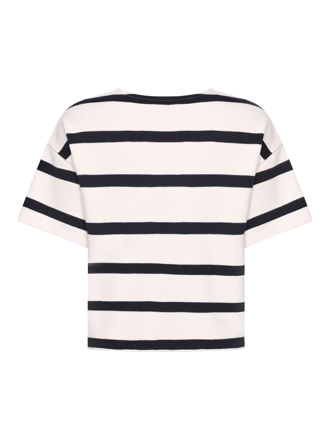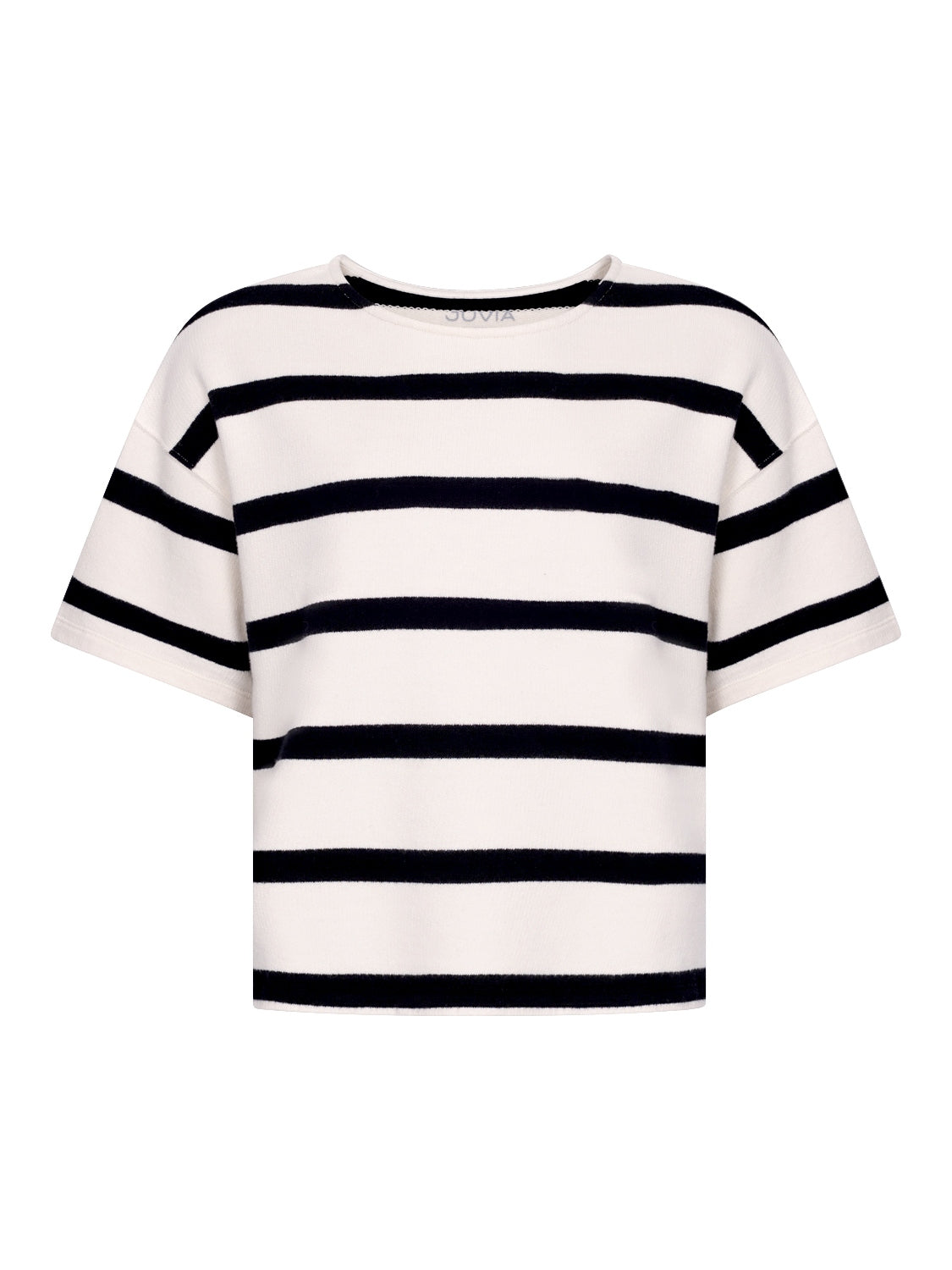 Dieses Oberteil besticht durch seinen klaren Rundhalsausschnitt und das zeitlose Streifenmuster, das jedem Look eine frische, maritime Note verleiht. Die kurzen, weit geschnittenen Ärmel sowie die überschnittene Schulterpartie sorgen für eine moderne, lockere Passform und machen das Tragen besonders angenehm. Die lässige Oversized-Silhouette verleiht dem Piece einen entspannten Charakter, während der gerade Saum mit seitlichen Schlitzen nicht nur das Design optisch auflockert, sondern auch für zusätzliche Bewegungsfreiheit sorgt. Ein vielseitiges und stilvolles Essential, das sich ideal in verschiedene Outfits integrieren lässt – perfekt für entspannte Tage und casual Looks mit Anspruch.