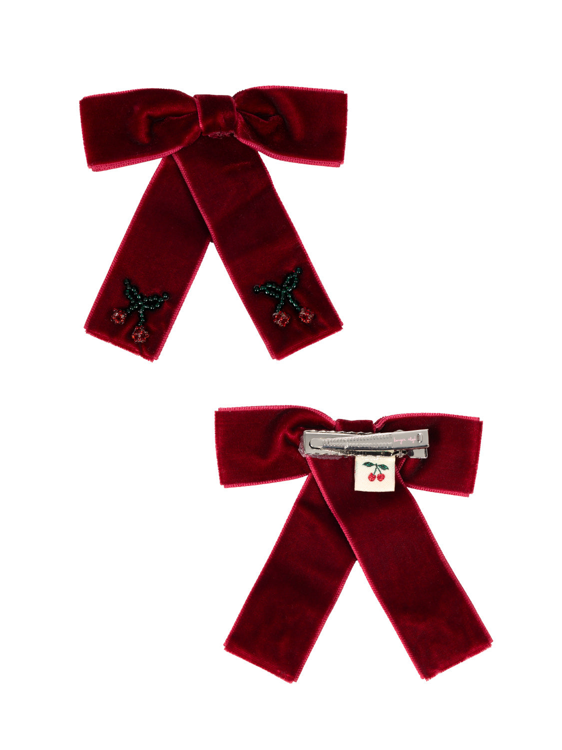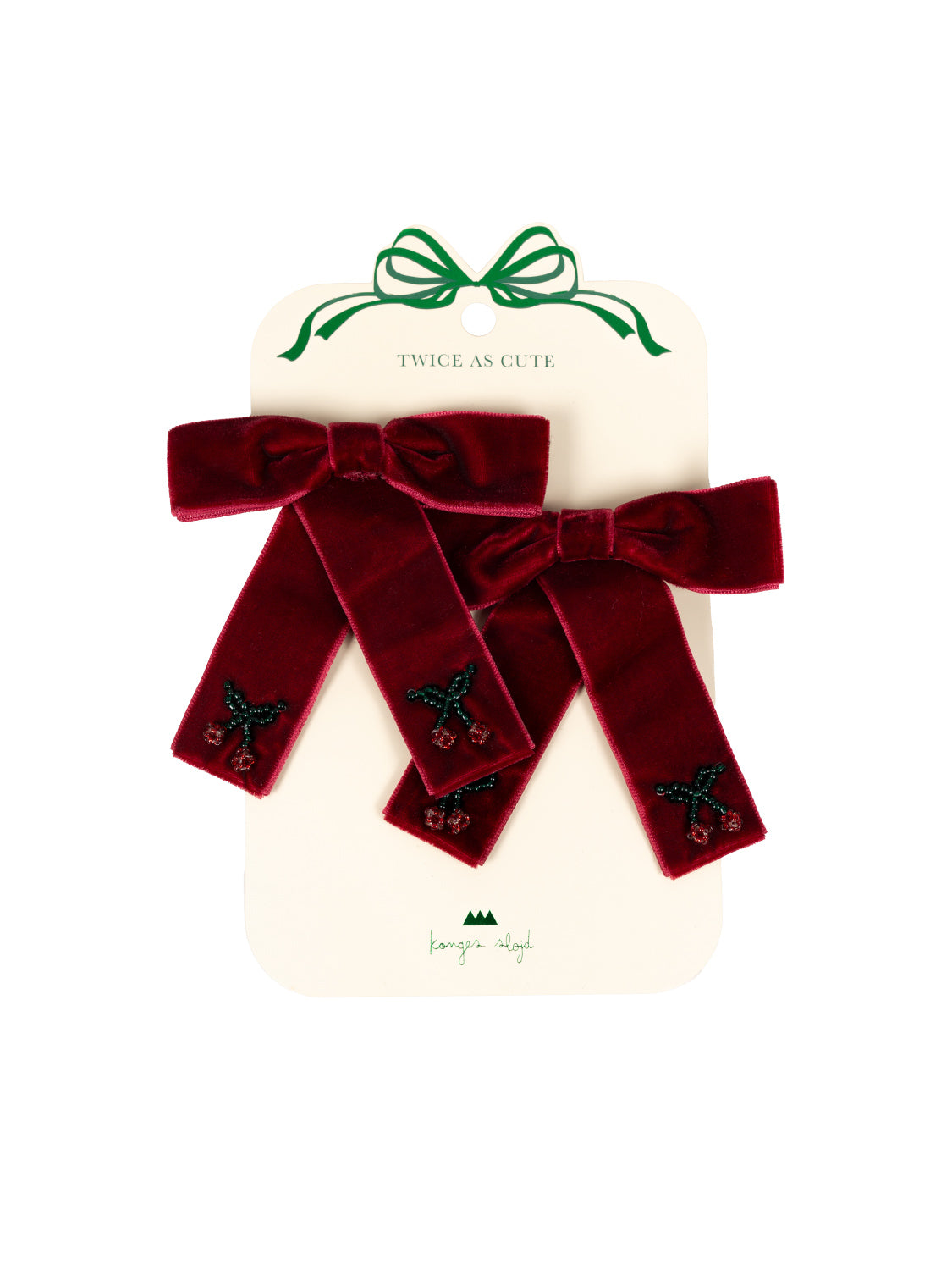 Dieses glamouröse Haarschleifen-Set des dänischen Herstellers Konges Sløjd verwandelt jede Frisur in ein raffiniertes Kunstwerk und enthält 2 festliche Haarspangen im exklusiven Design. Die robusten Krokodilklemmen sind mit einer zierlichen Samtschleife in Bordeauxrot verziert und halten die Haare perfekt an Ort und Stelle - einfach ideal für die Feiertage oder den Alltag, um jedem Outfit das gewisse Etwas zu verleihen. Kleine aus Glasperlen geknüpfte Kirsch-Details vollenden das süße und unverkennbare Konges Sløjd Design.