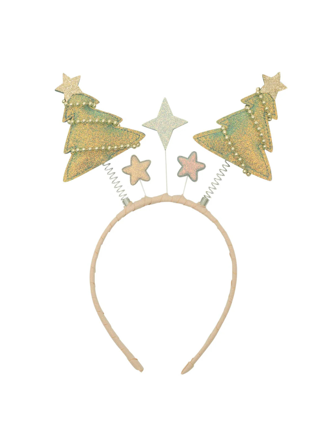 Weihnachtsbäume zum Wackeln – der glitzernde Bopper-Haarreif von Mimi & Lula ist zum Fest ein charmanter Hingucker. Auf dem Haarreif tanzen zwei glitzernde Weihnachtsbäume fröhlich auf stabilen Federn und bringen jede Menge Schwung ins Festtagsoutfit. Ob bei der Weihnachtsfeier, dem Krippenspiel oder einfach, weil’s Spaß macht – dieser Haarreif sorgt garantiert für Lacher und leuchtende Kinderaugen. Der mit Glitzerstoff umwickelte Reifen ist mit drei funkelnden Sternen verziert, während die beiden wackelnden Bäumchen von goldenen Perlenketten sowie glitzernden Sternspitzen geschmückt werden. Ein humorvoller Hingucker, der trotzdem stilvoll bleibt – wie gemacht für kleine Weihnachtsfans mit großem Auftritt.