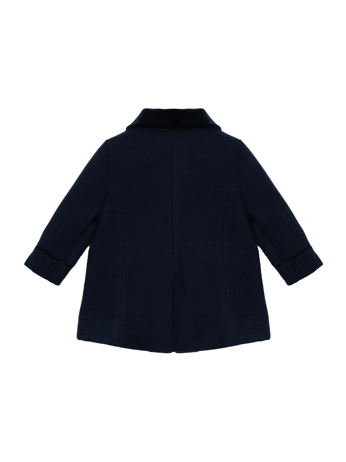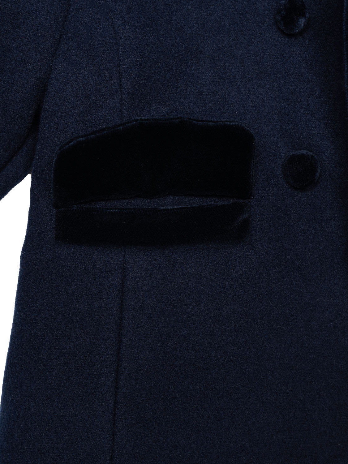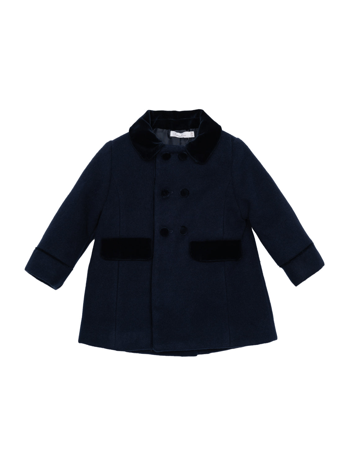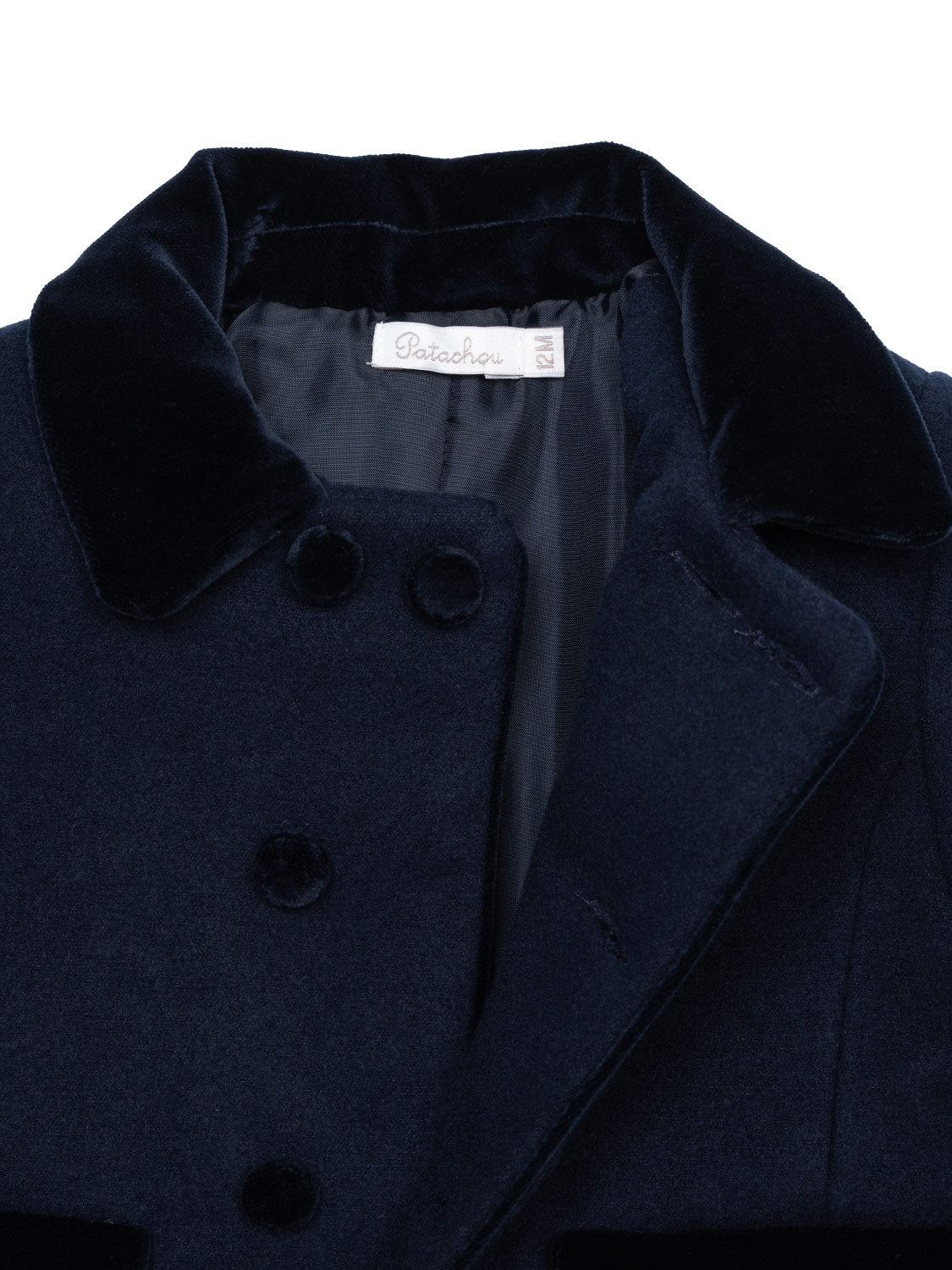 Dieser elegante marineblaue Mantel im traditionellen Stil für Jungen von Patachou wird aus einer weichen Baumwollmischung mit leichter Polsterung und leichtem Baumwollfutter gefertigt. Die Knöpfe des zweireihigen Verschlusses auf der Vorderseite sind passend zum klassischen Kragen und den Taschenbesätzen mit Samt überzogen.
