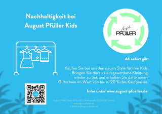 Sie die zu klein gewordenen Kleidungsstücke in unseren Shop zurück und wir schenken Ihnen einen Gutschein für Ihren nächsten Einkauf bei uns im Kids Store.