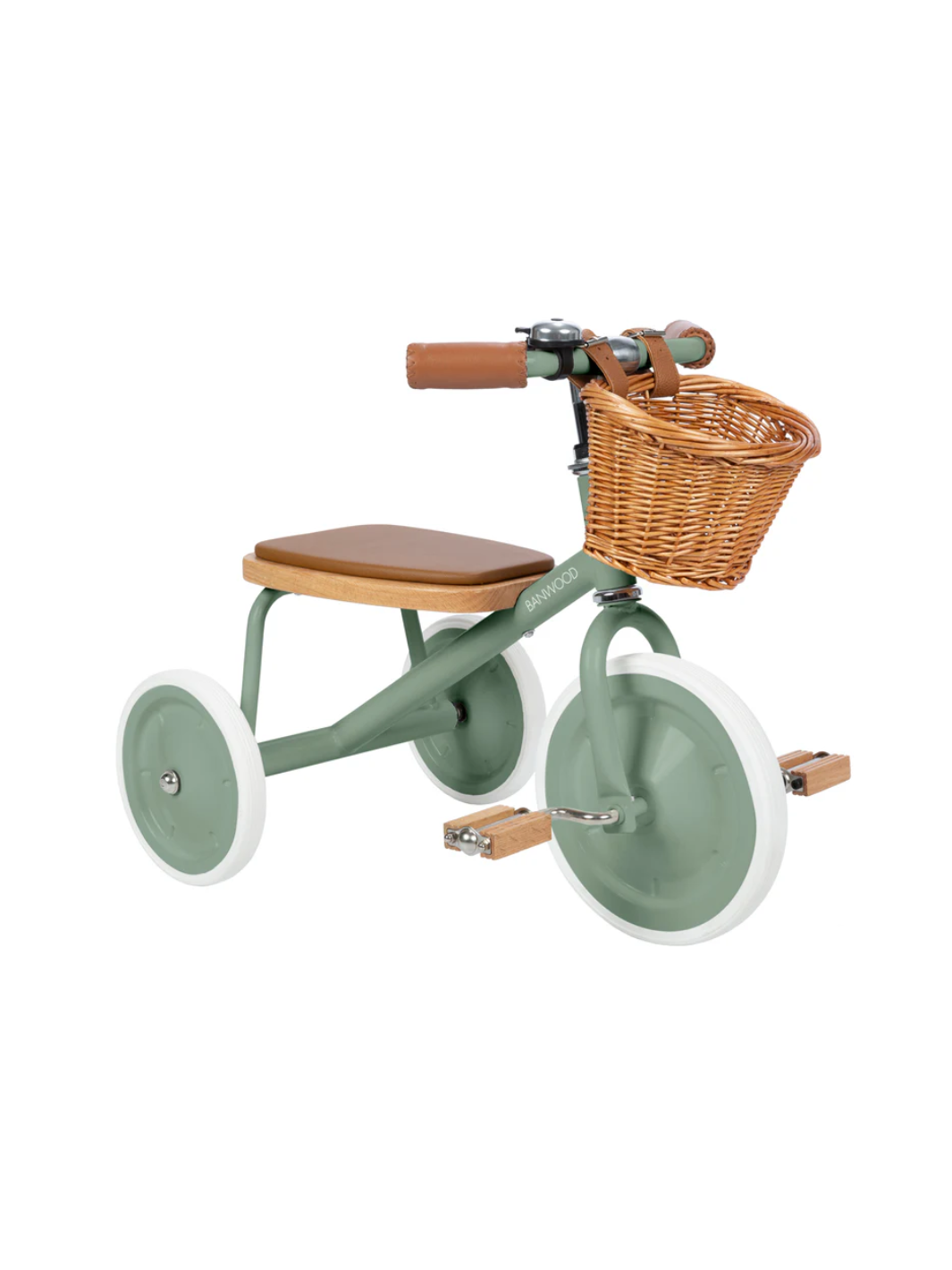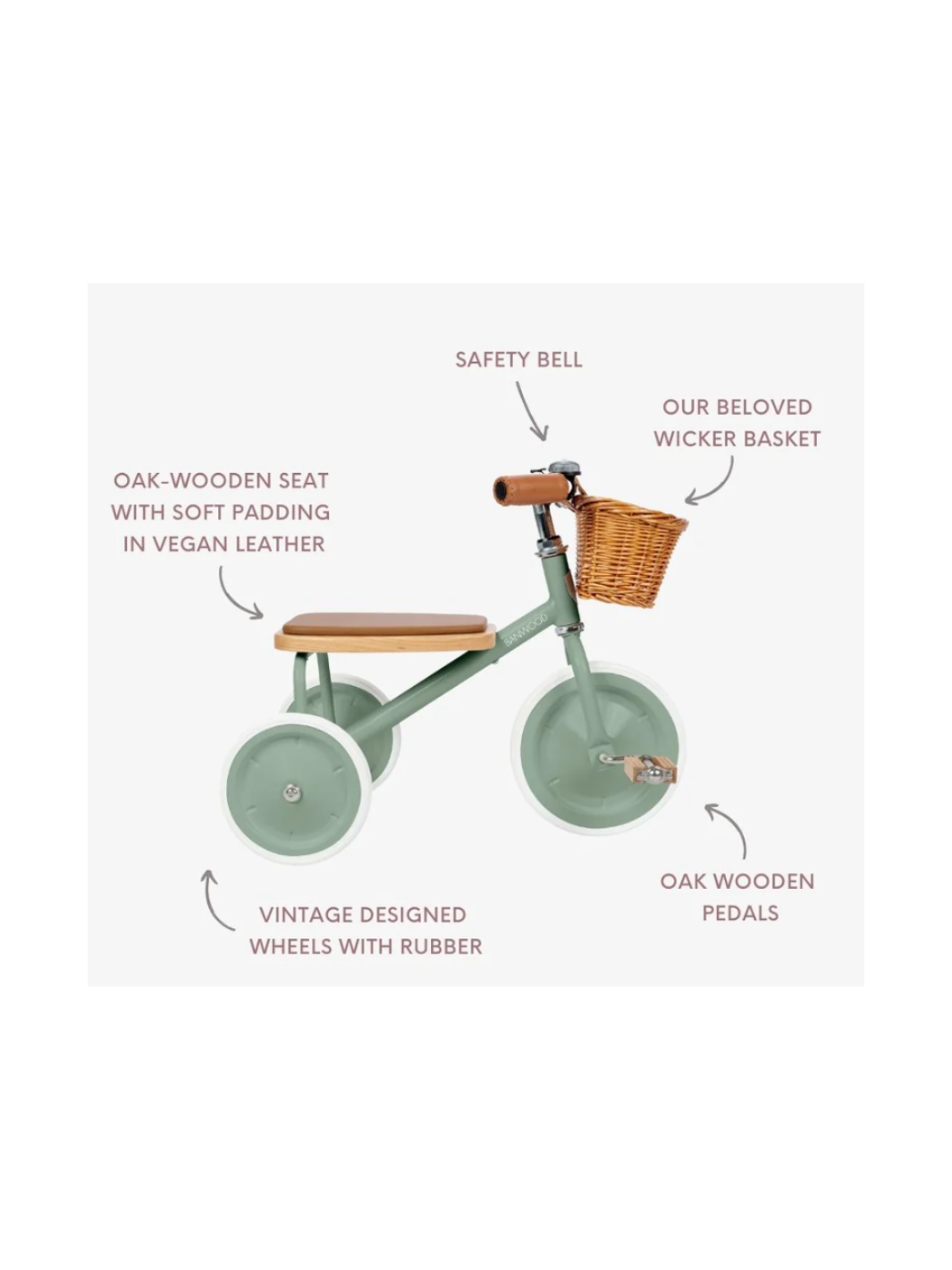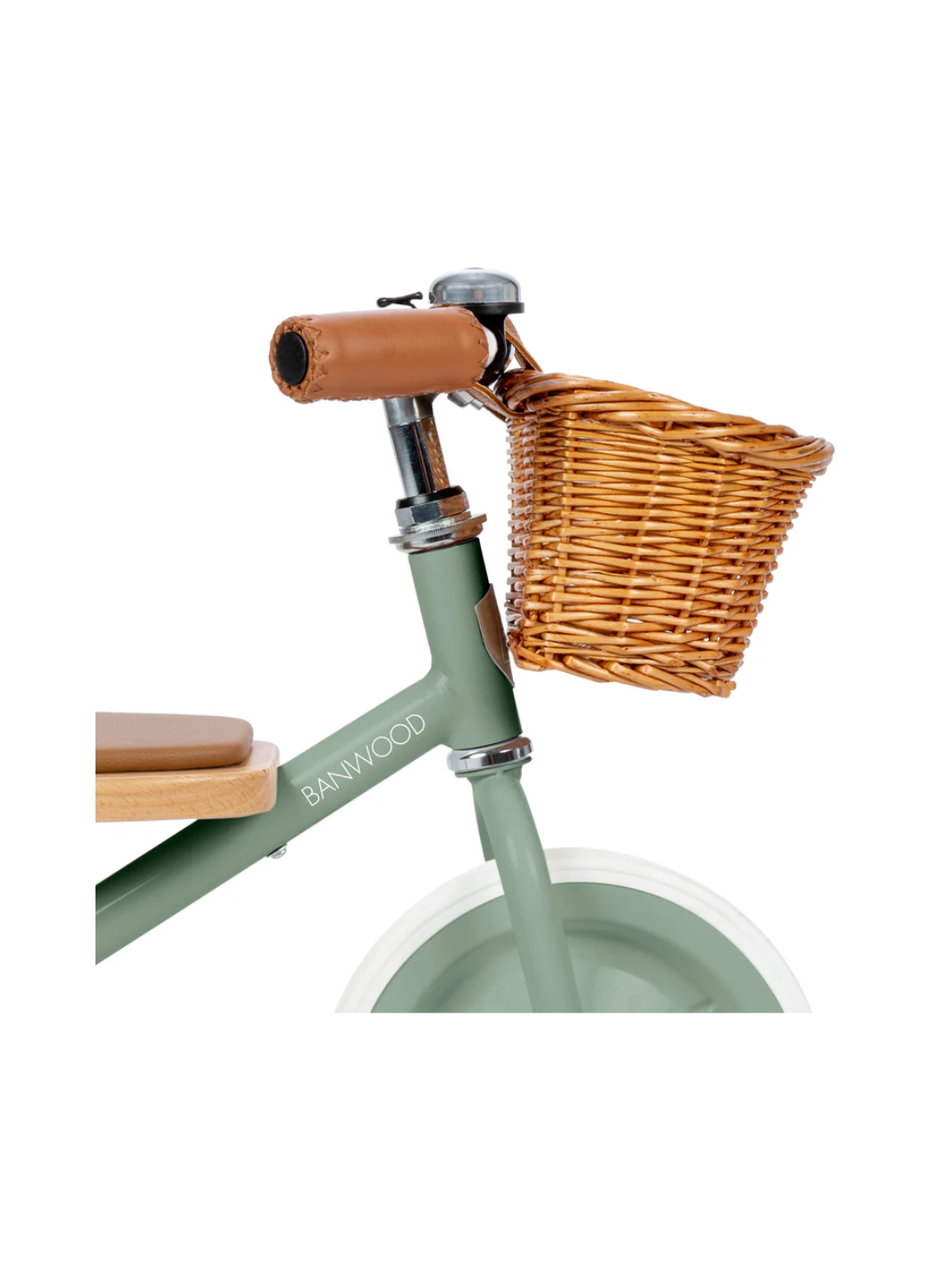 Es ist ab 2 Jahren geeignet und für Generationen konzipiert. Es verfügt über einen weich gepolsterten Eichensitz, Pedale aus Eichenholz und Details aus veganem Leder. Vorne sorgt ein hübscher Weidenkorb dafür, dass das Nötigste für den Park stets griffbereit ist.
