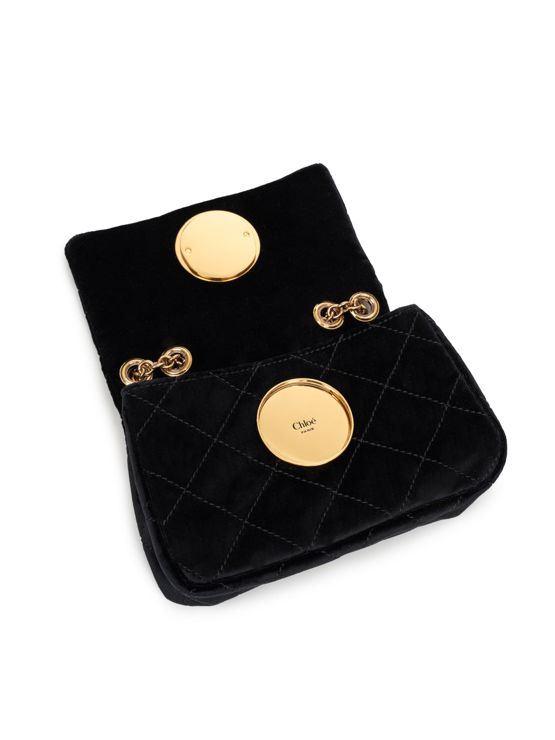 Diese kompakte Schultertasche aus gestepptem Samt vereint klassische Chloé-Elemente mit modernem Design. Ihre geschwungene Silhouette wird durch goldfarbene Details und den ikonischen Horse Medal Verschluss mit zarten Anhängern stilvoll akzentuiert.