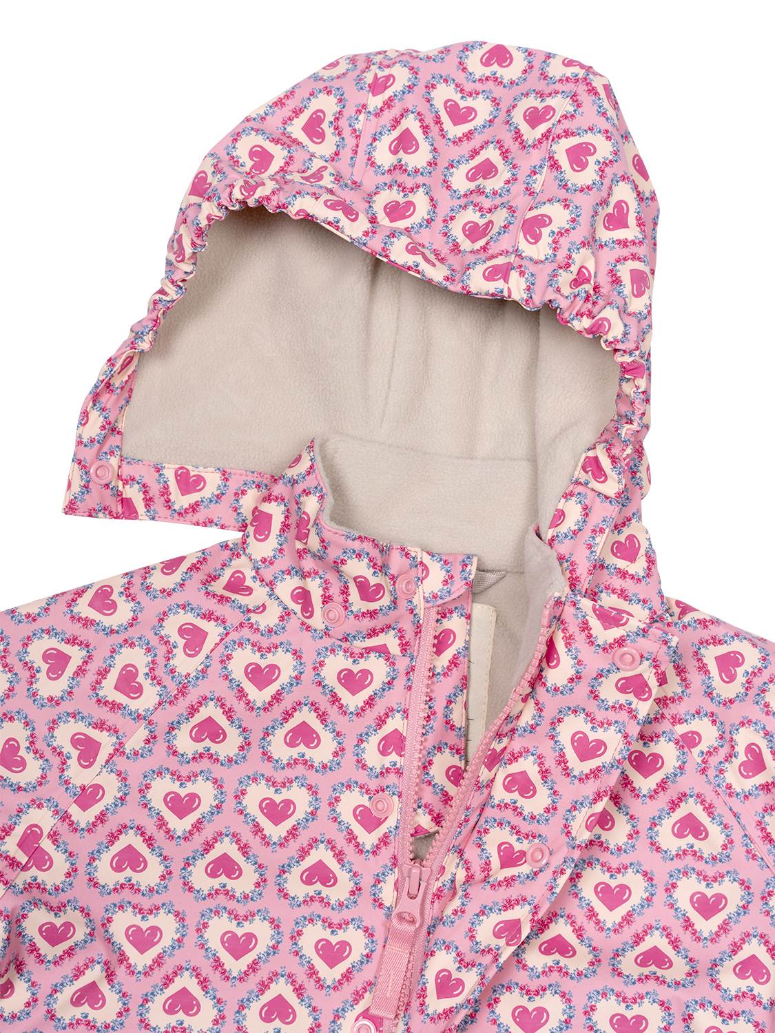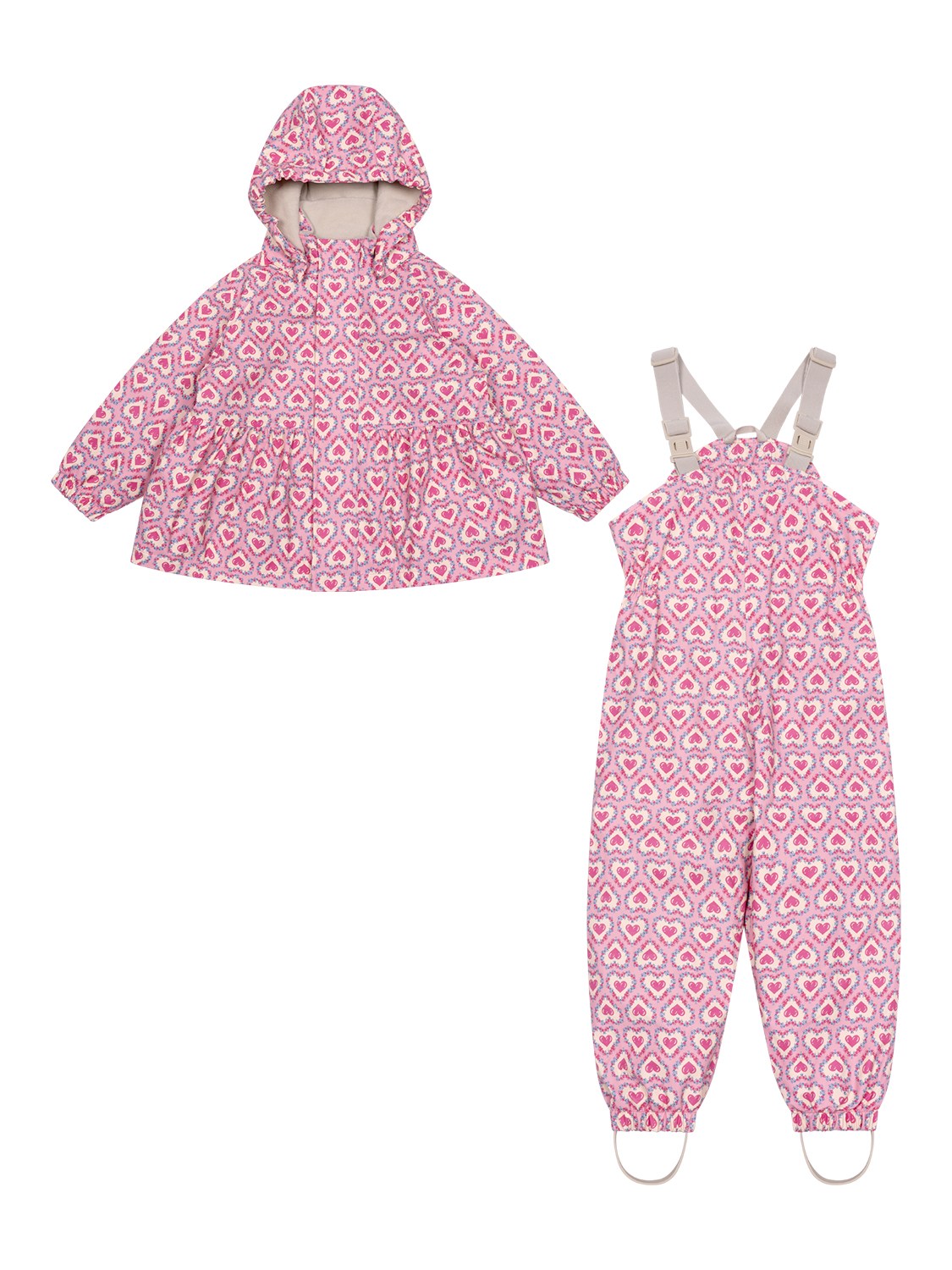 Dieses bezaubernde Regenset in Rosa von Konges Sløjd besteht aus einer Regenjacke mit passender Latzhose im süßen Herzchen-Design. Das wind- und wasserdichte PU Regenset ist mit einem warmen Innenfutter aus kuschelweichem Fleece ausgestattet. Zudem überzeugt der Zweiteiler mit einem durchdachten Design, wie einer gefütterten, abnehmbaren Kapuze, elastischen Bündchen und verschweißten Nähten, für besten Schutz bei unbeständigem Wetter.