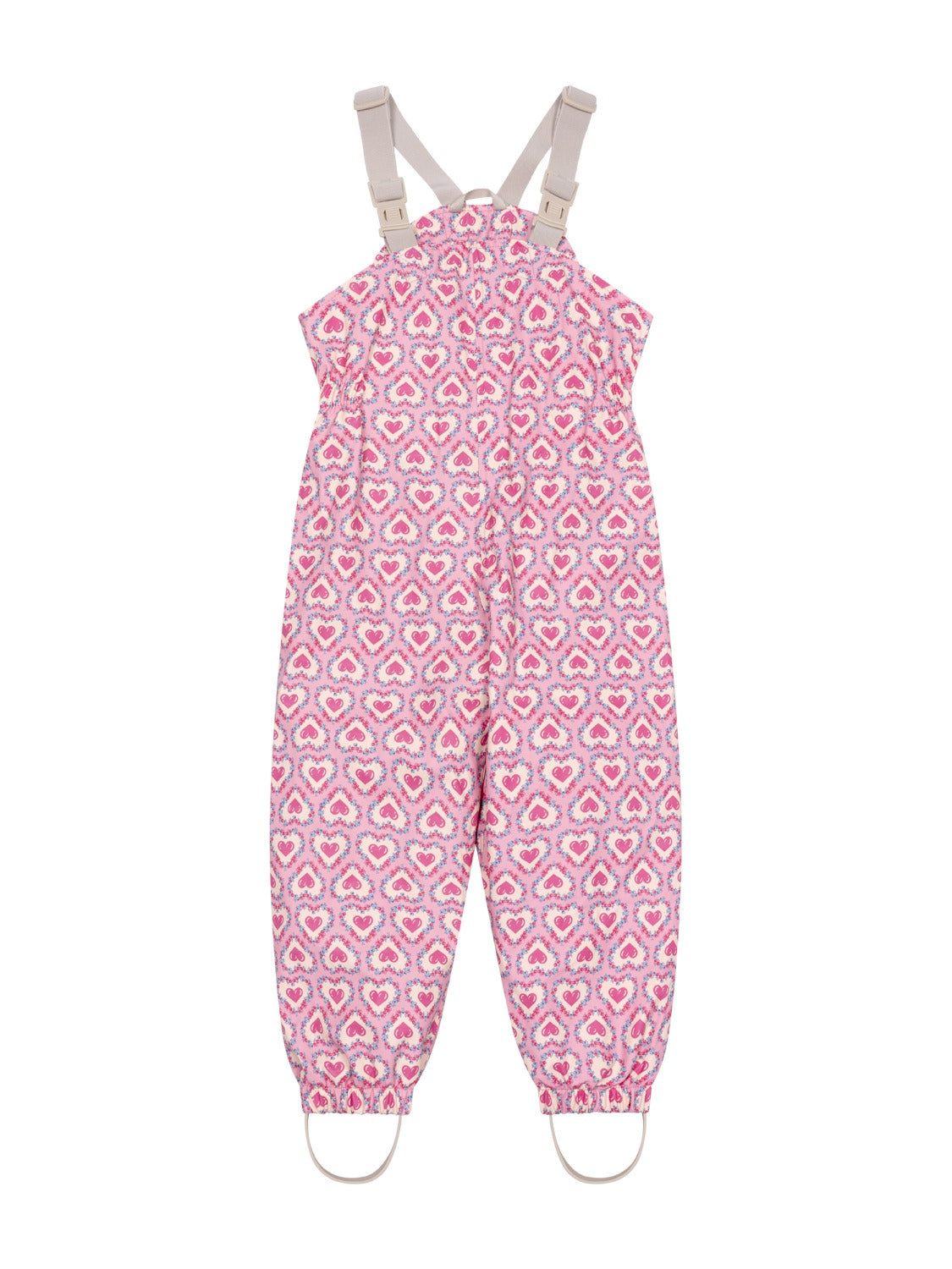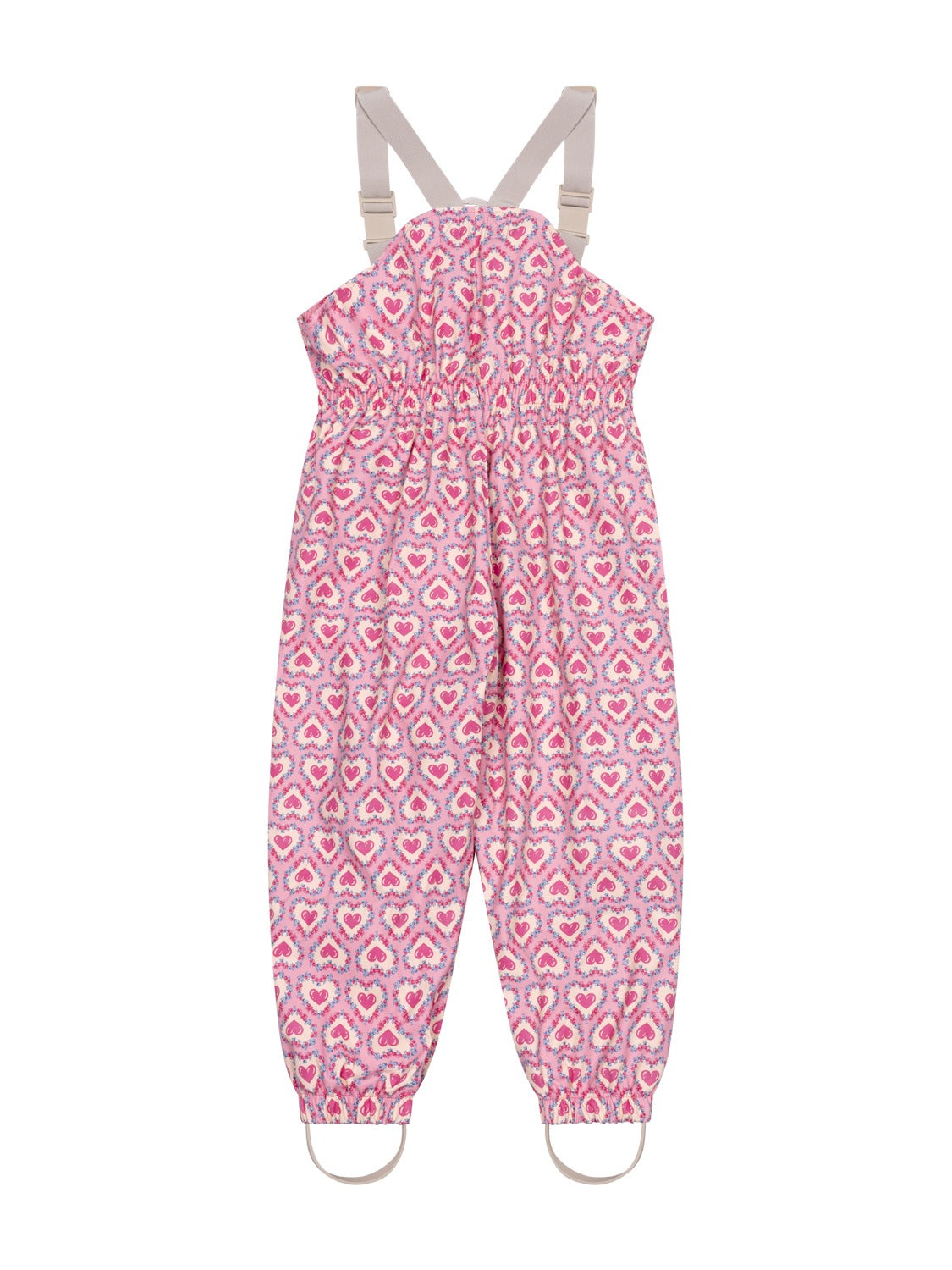 Neben verstellbaren Trägern und einer elastischen Taille verfügt die Regenhose über praktische, abnehmbare Stiefelriemen.