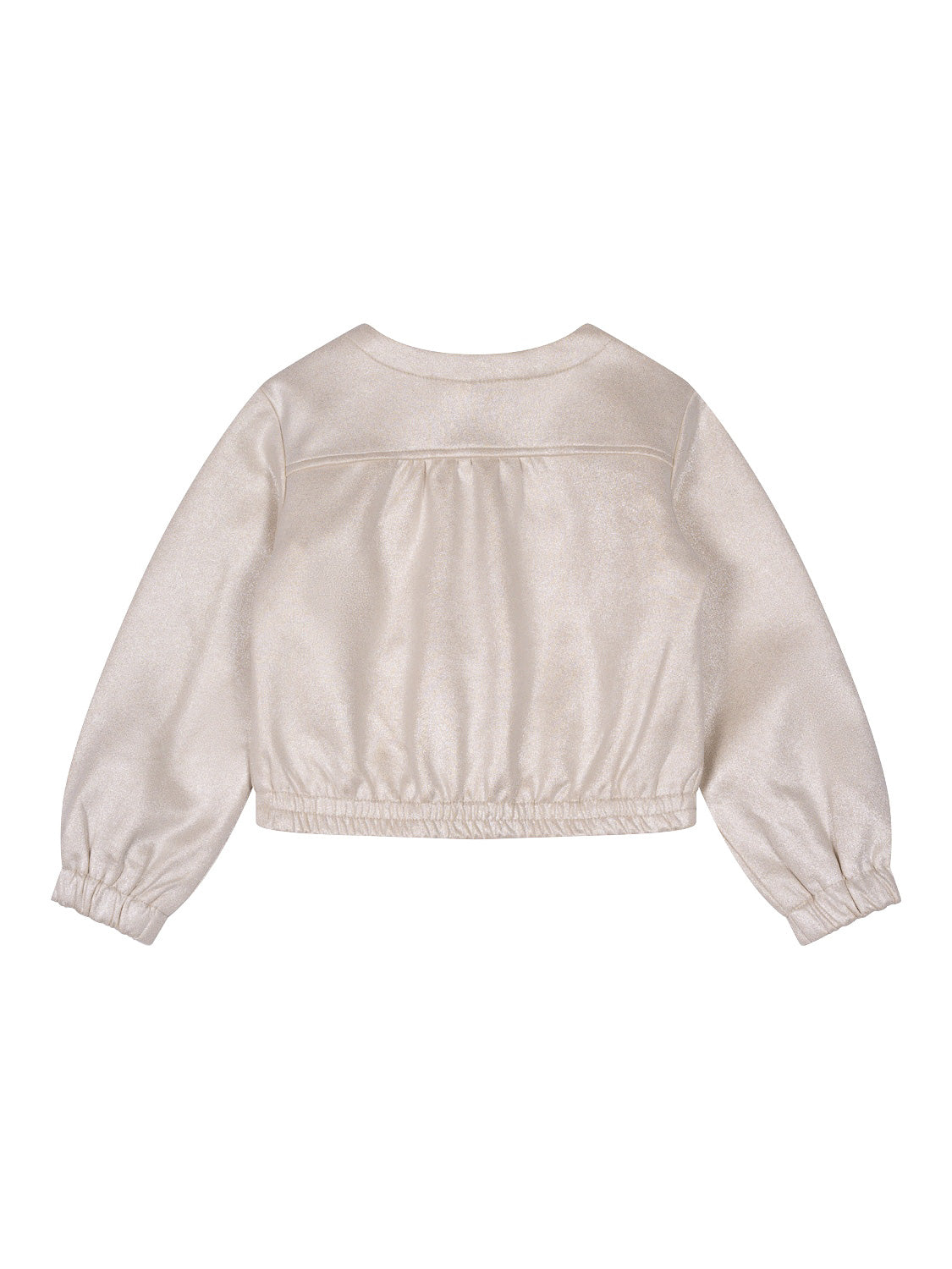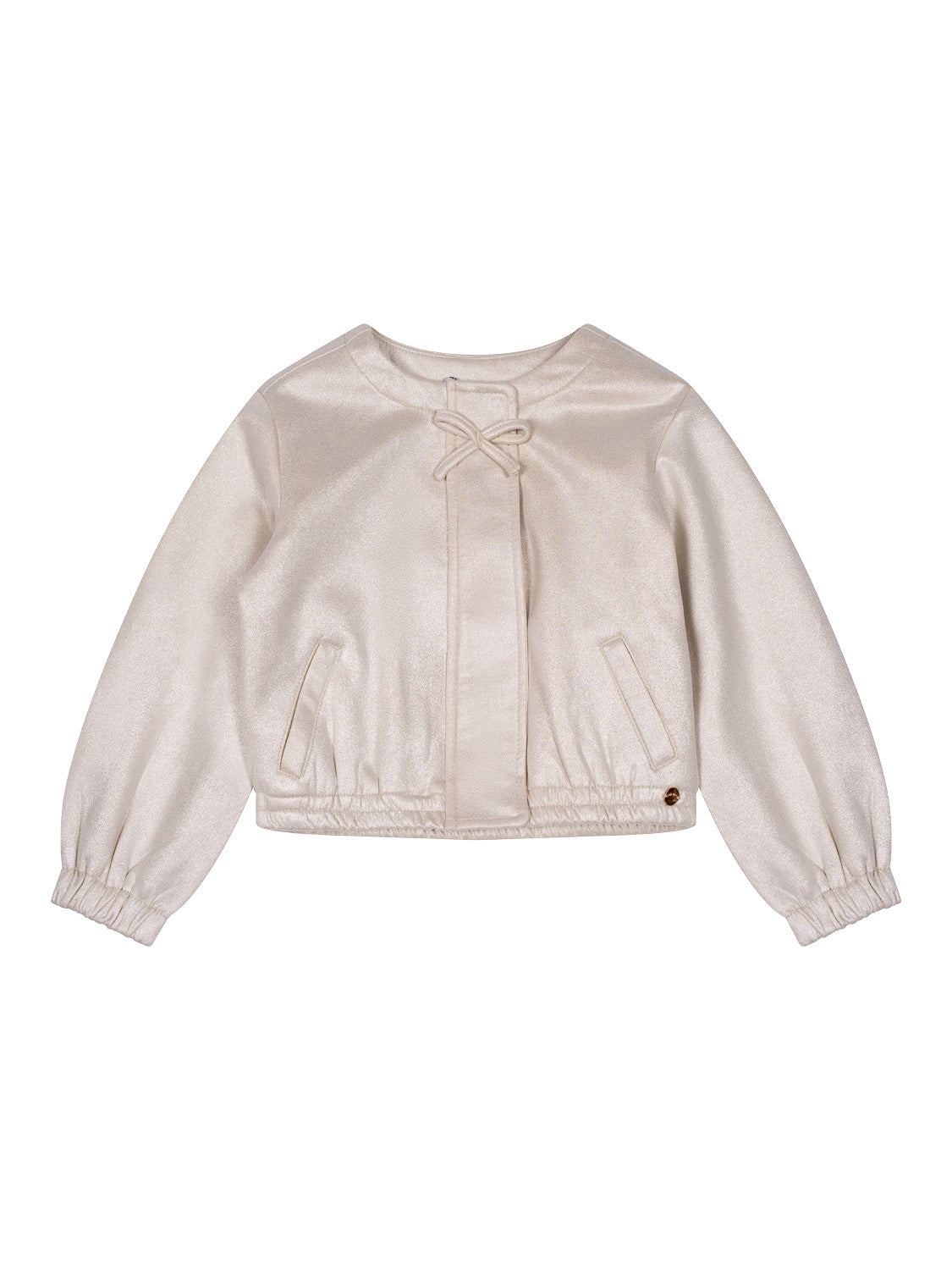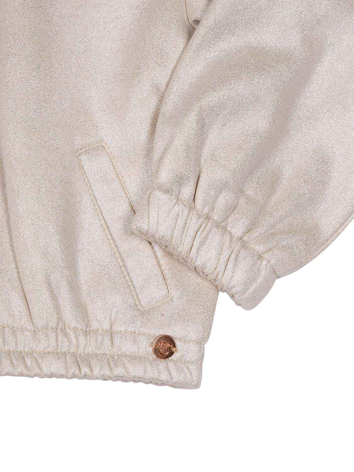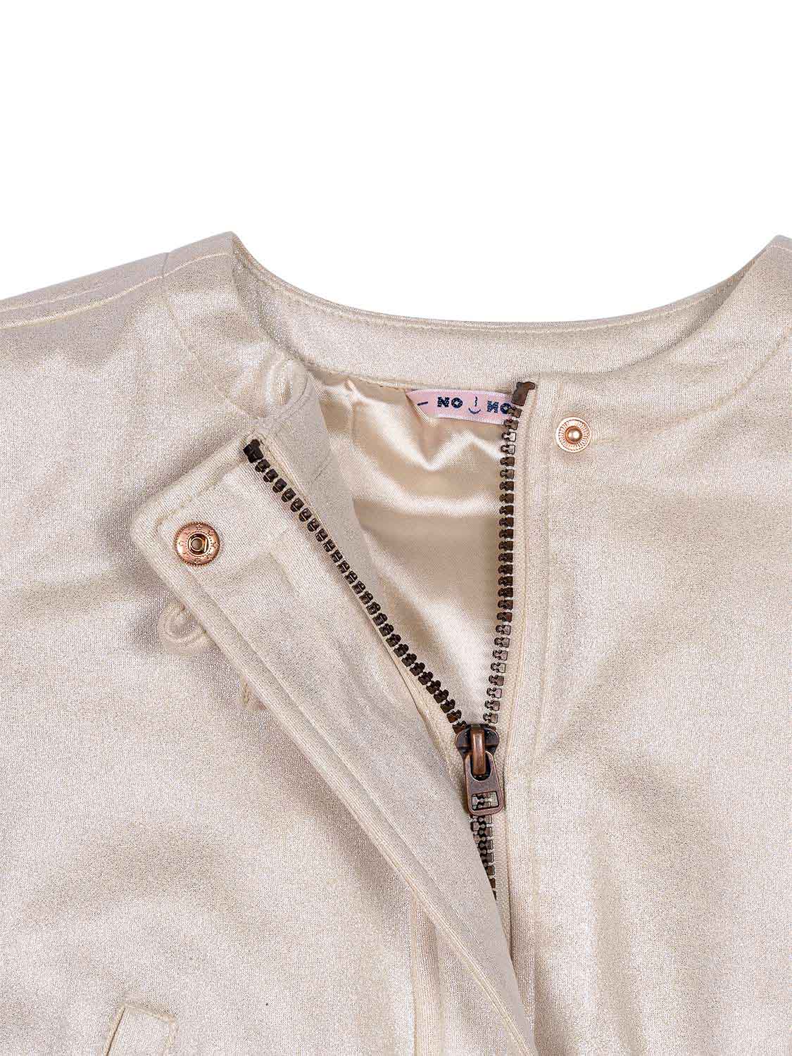 Die bezaubernde Door Jacke in Pearled Ivory von NoNo präsentiert sich im coolen Metallic-Wildleder-Look. Der verdeckte Frontreißverschluss ist am Kragen mit einem Druckknopfverschluss ausgestattet und mit einer applizierten Schleife verziert. Elastische Abschlüsse an Ärmelbündchen und Saum sorgen für die perfekte Passform und höchsten Tragekomfort.