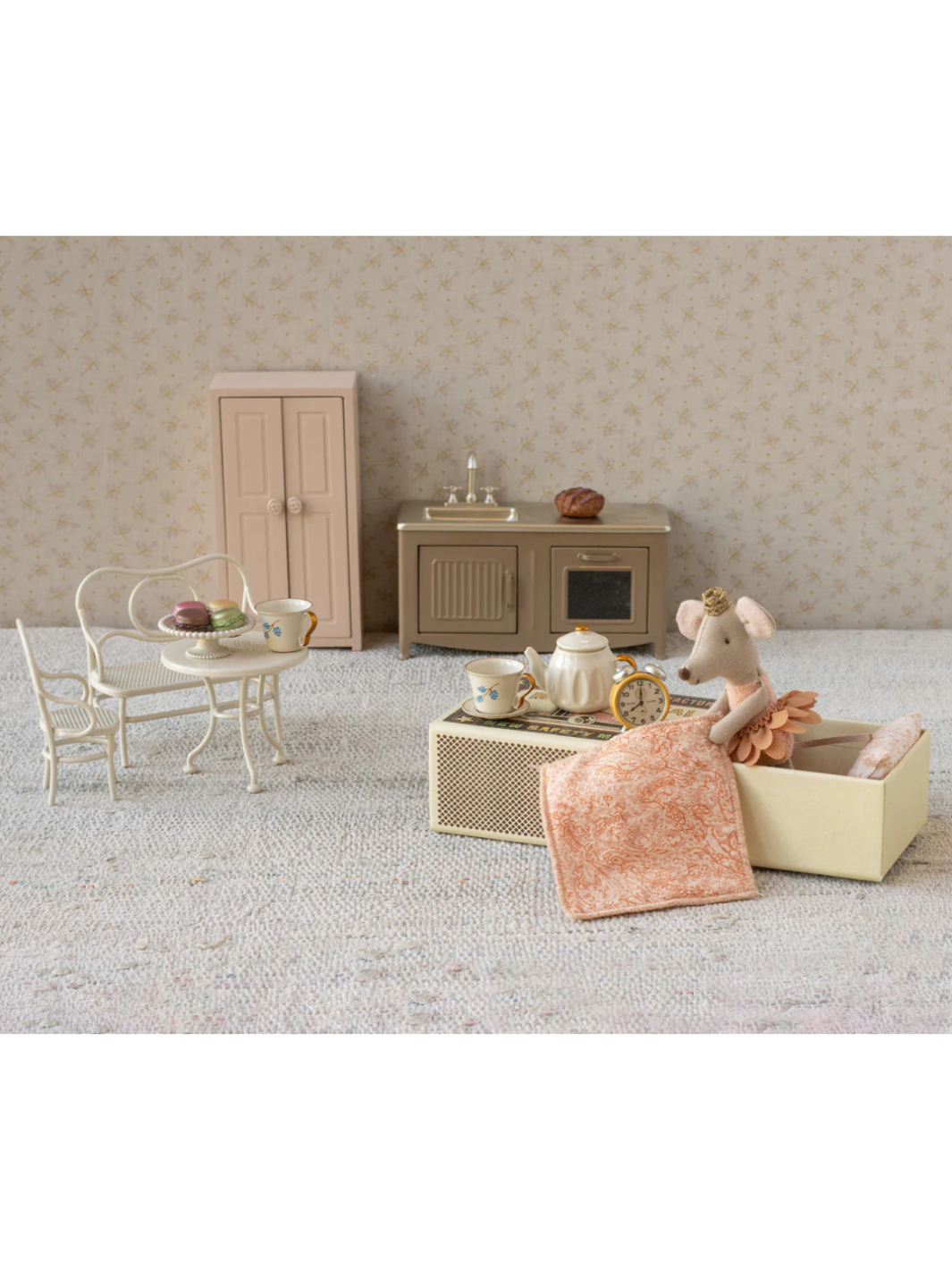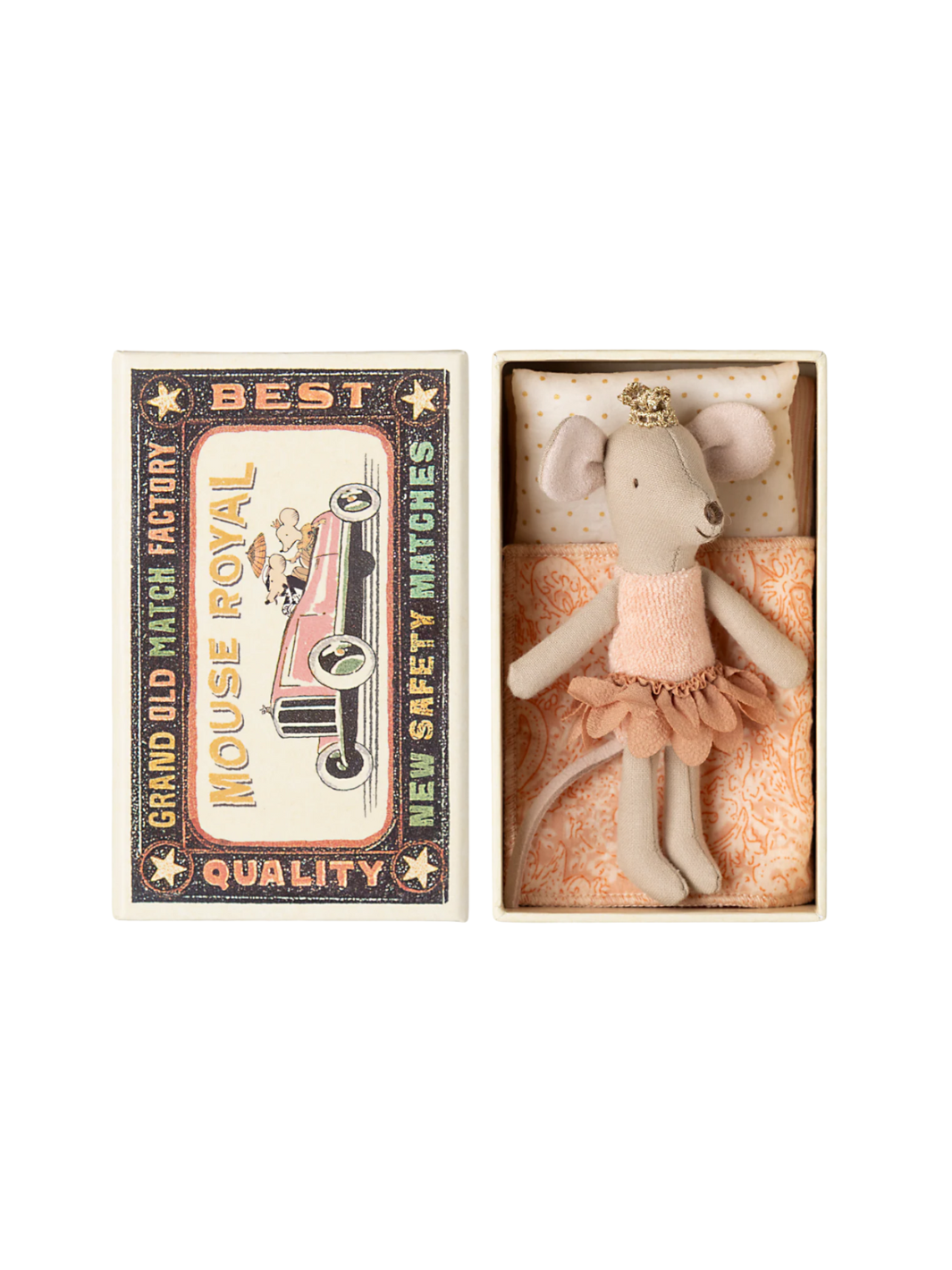 Die kleine Prinzessin Maus ist unwiderstehlich. Sie ist bereit für stundenlanges Spielen und schläft fest in einer Streichholzschachtel. Die Kleidung und Bettwäsche haben einzigartige Drucke und schönen Farben. Die Bettwäsche kann in der Farbe variieren.