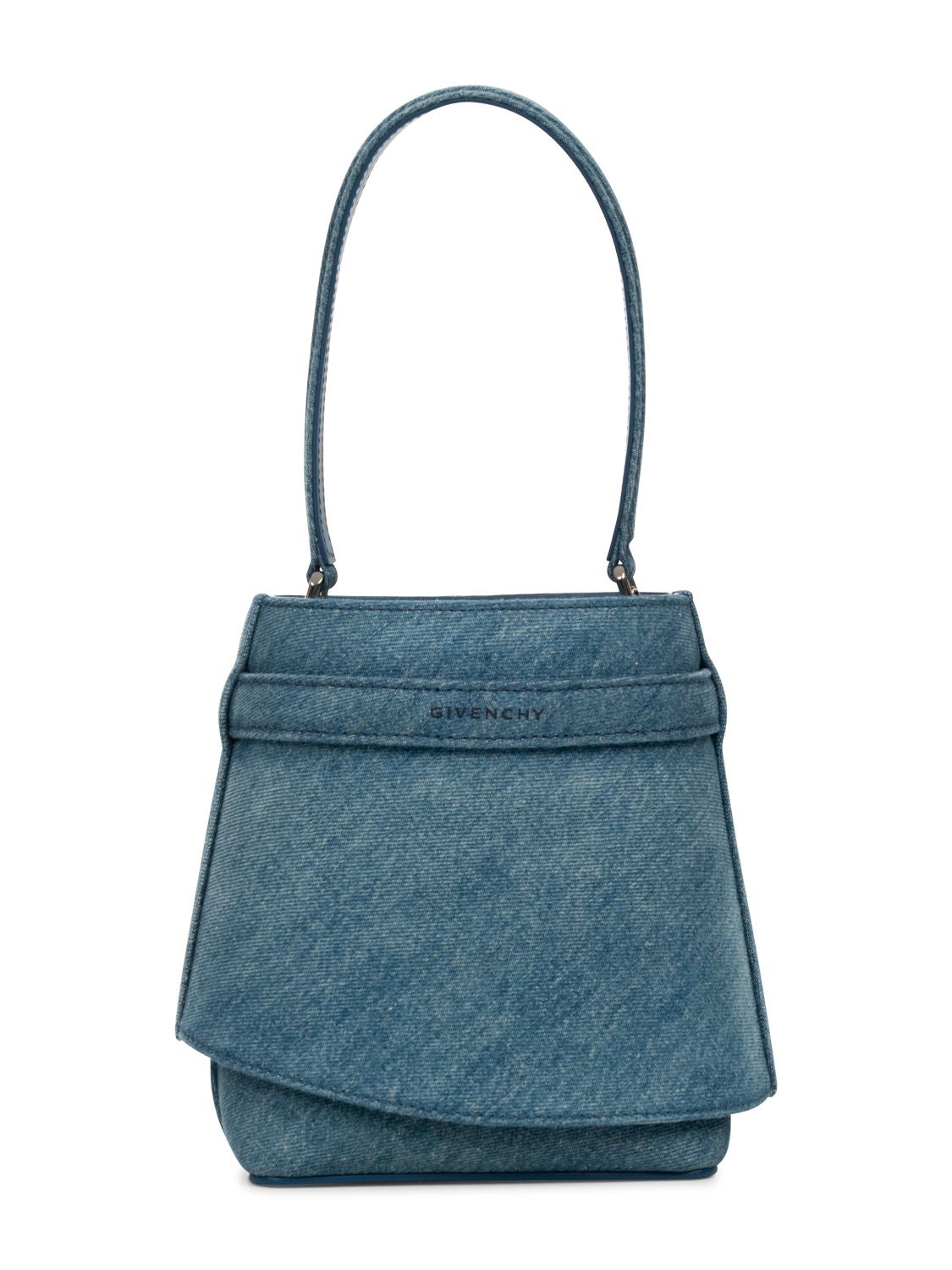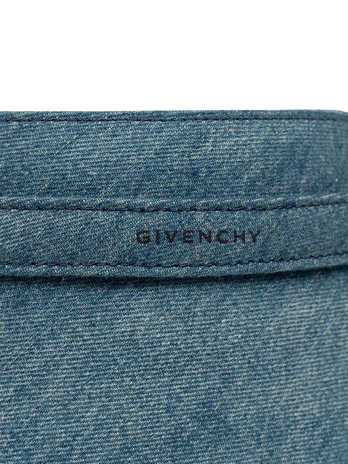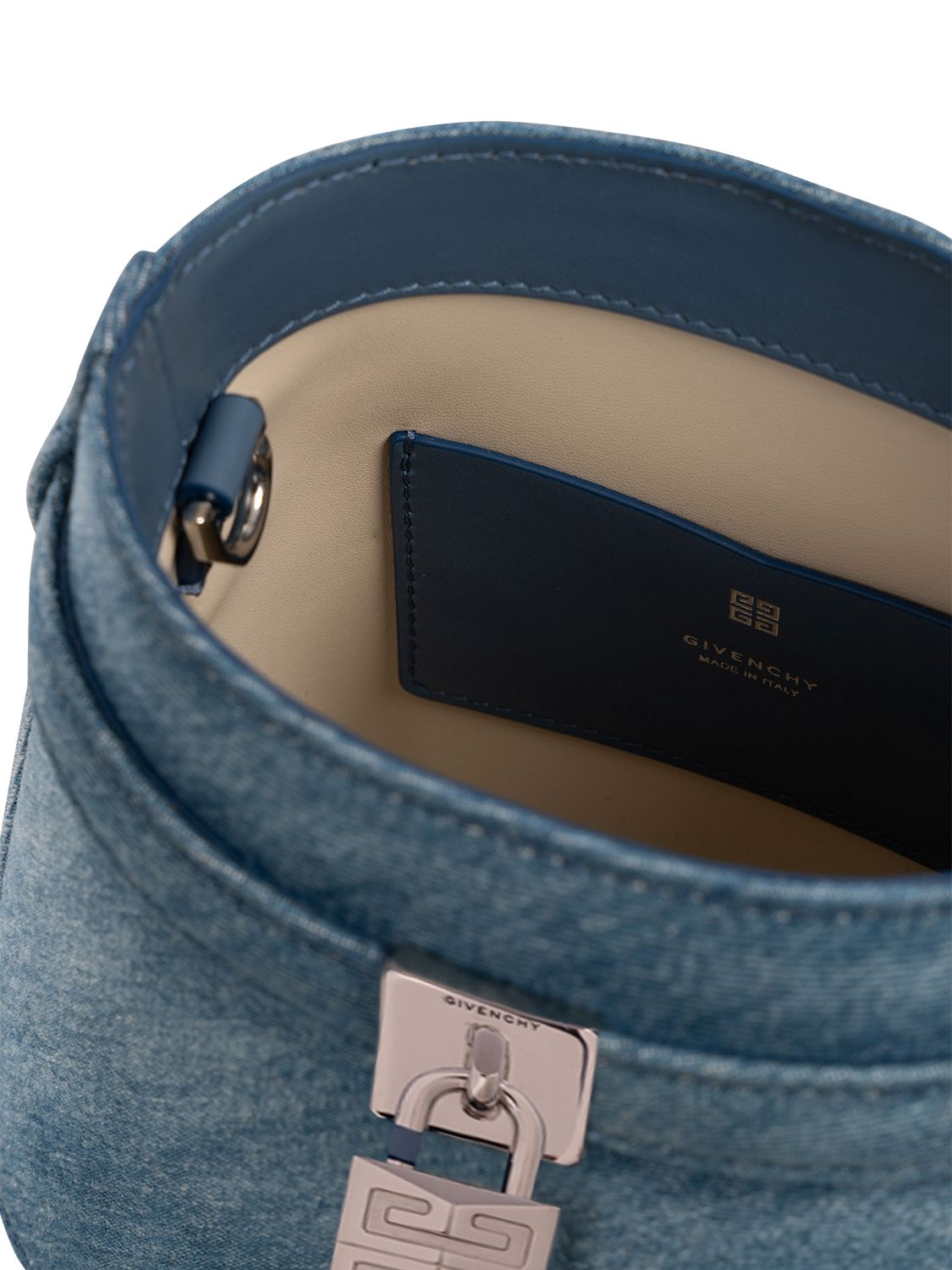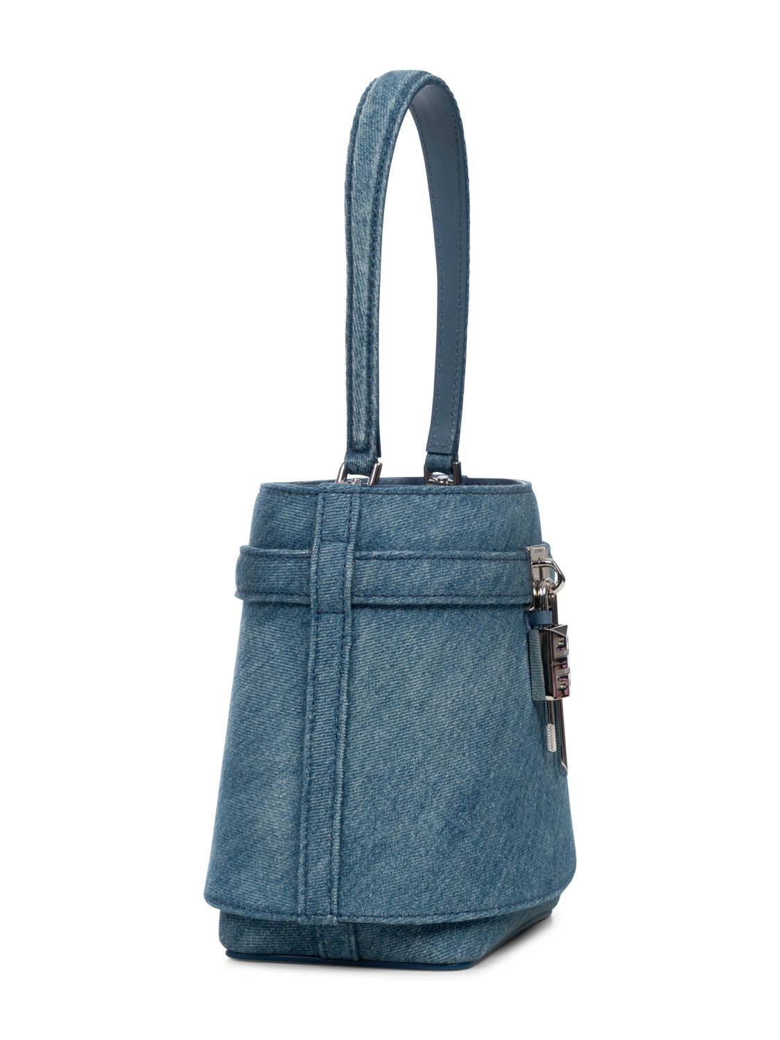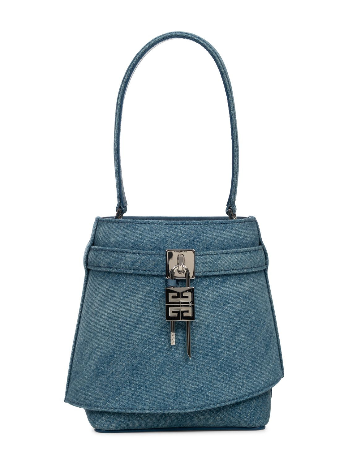 Die Shark Lock Bucket Bag von Givenchy ist aus gewaschenem Denim gefertigt und ist mit einem Denimband mit GIVENCHY-Metallschließe sowie 4G- Schloss auf der Vorderseite versehen.
