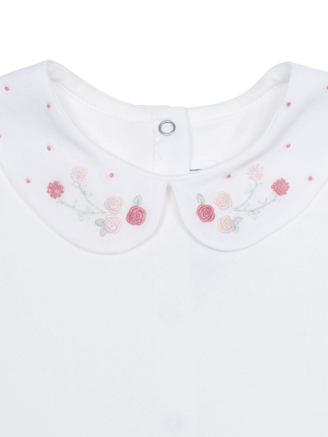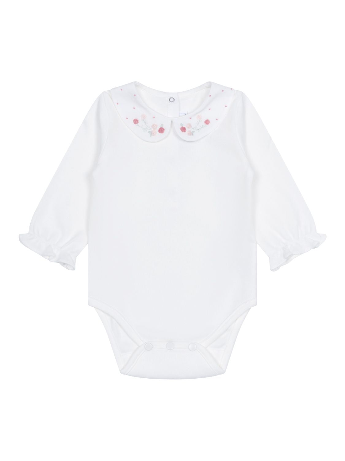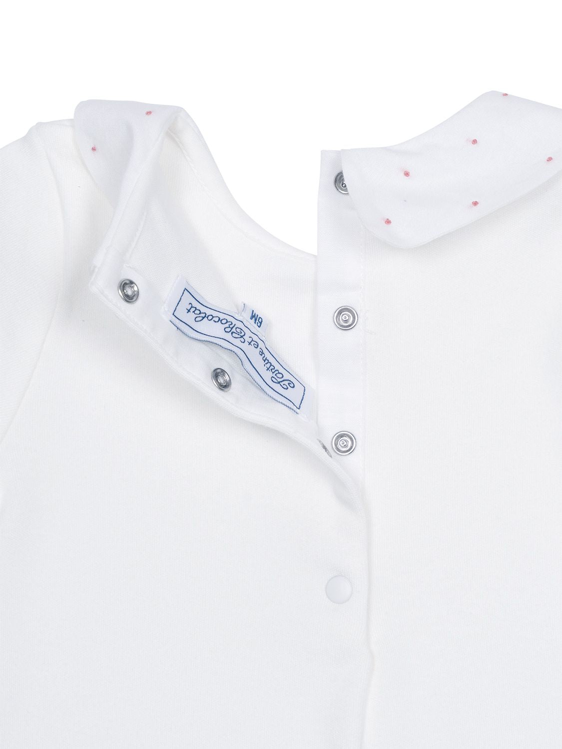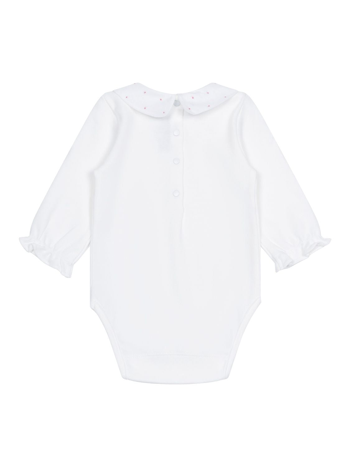 Dieser bezaubernde Mädchen-Body in Weiß von Tartine et Chocolat besticht mit einer Herstellung aus hochwertiger, besonders weicher Baumwolle, während ein eleganter Bubi-Kragen von zarten Blumen- und Pünktchen-Stickereien eine verspielte Note erhält. Neben langen Ärmeln mit elastischen Rüschen-Bündchen verfügt das Modell über einen praktischen Druckknopfverschluss im Nacken- und Windelbereich.