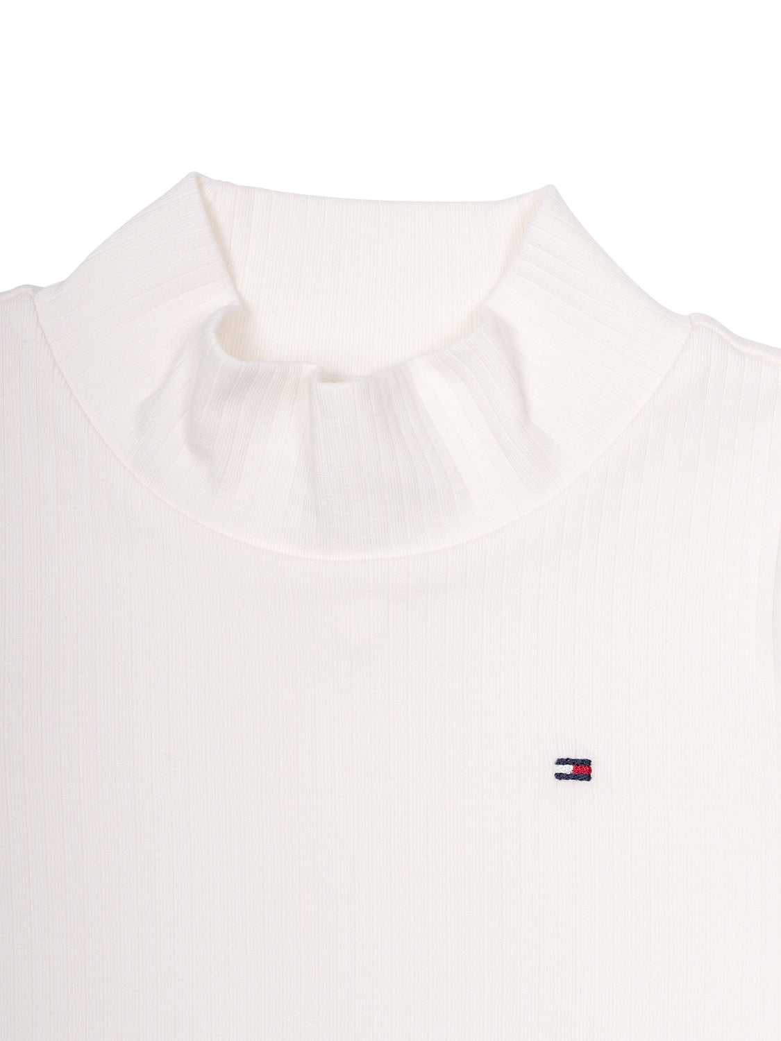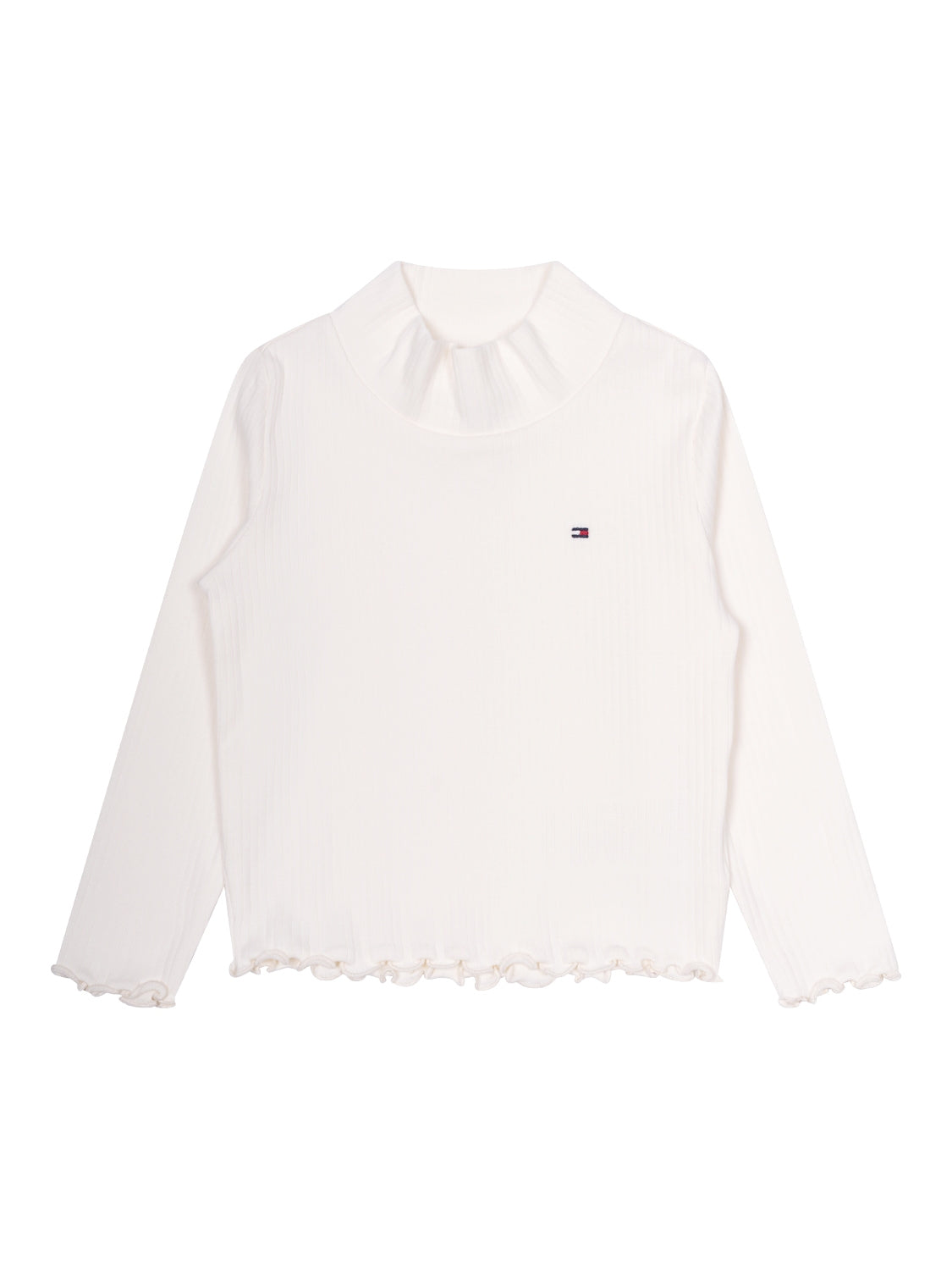 Dieses süße Langarmshirt in Weiß für Mädchen von Tommy Hilfiger verspricht dank einer Fertigung aus anschmiegsamer, gerippter Stretch-Baumwolle ein angenehmes Tragegefühl und besticht mit einem schlichten Design und zeitloser Eleganz. Raffinierte Kräuselsäume an Bündchen und Saum verleihen dem Look ein verspieltes Finish, während ein elastischer Stehrkragen das Gesamtbild gekonnt vollendet. Auf der Brust werden von der ikonischen Logo-Flag-Stickerei labeltypische Akzente gesetzt.