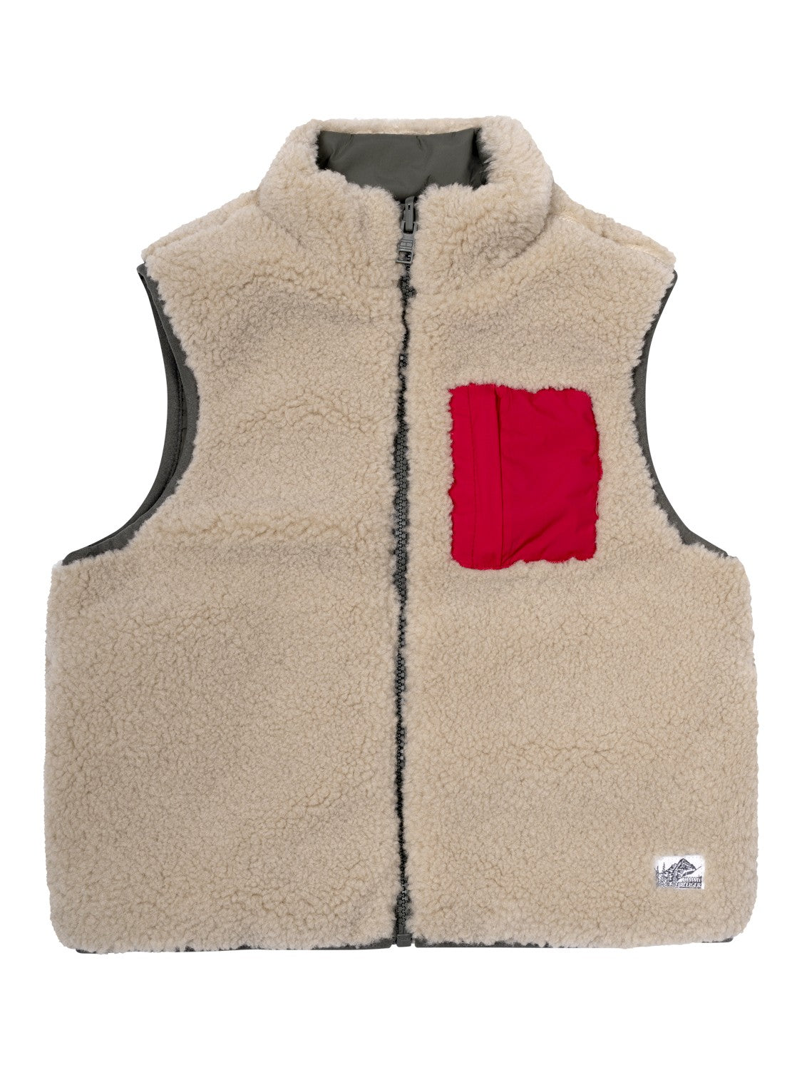 Die Weste verfügt über einen Frontreißverschluss, einen Stehkragen sowie eine gerade Passform. Auf der einen Seite präsentiert sich die Weste mit kuschelweichem, beigefarbenen Teddyfleece, während eine aufgesetzte Reißverschluss-Brusttasche in kontrastierendem Rot raffinierte Akzente setzt. Das Logo-Etikett auf der Vorderseite sowie das auffällige Logo-Flag-Detail auf der Rückseite verleihen dem Look ein labeltypisches Finish. Wird das Modell gewendet, erscheint es Unifarben in Olivgrün und begeistert mit einem einzigartigen Steppmuster, seitlichen Eingriffstaschen sowie der ikonischen Logo-Flag Stickerei.