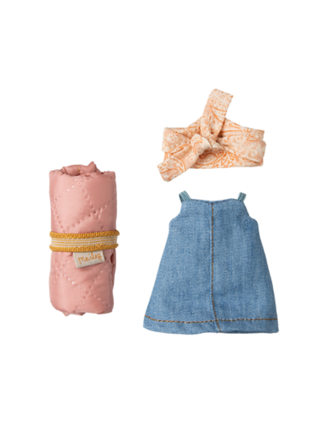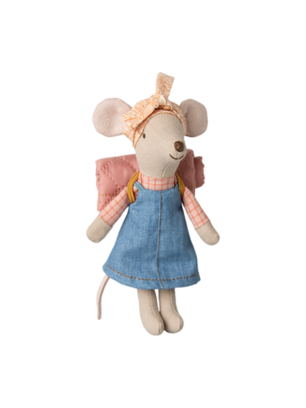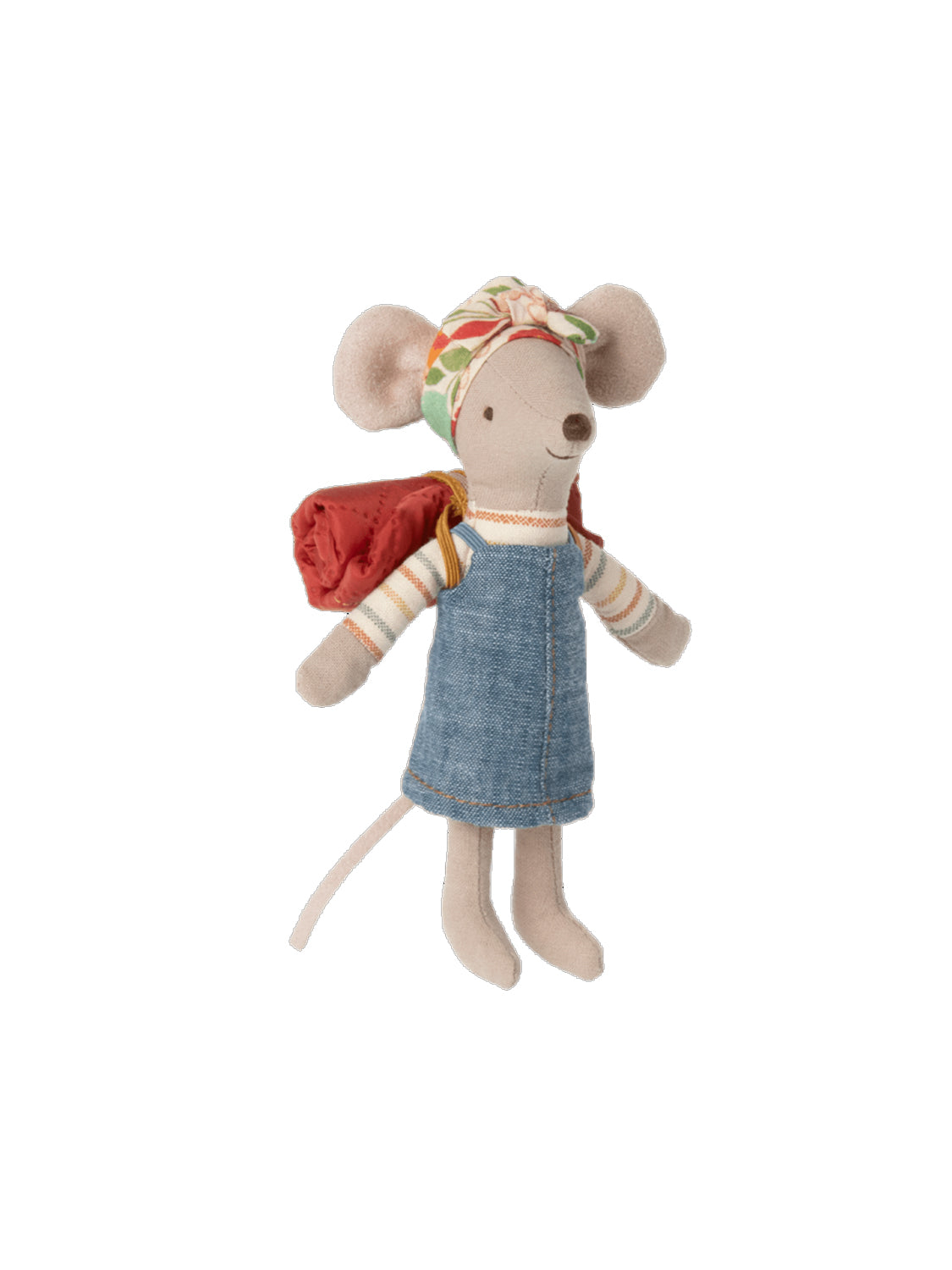 Die Große Schwester Wandermaus ist perfekt ausgerüstet für Abenteuer in der Natur und trägt ein süßes Haarband und ein blaues Jeanskleid. Mit dabei hat sie ihren Schlafsack, den sie ganz komfortabel auf dem Rücken tragen kann. So steht Nächten unter dem Sternenhimmel nichts im Wege.