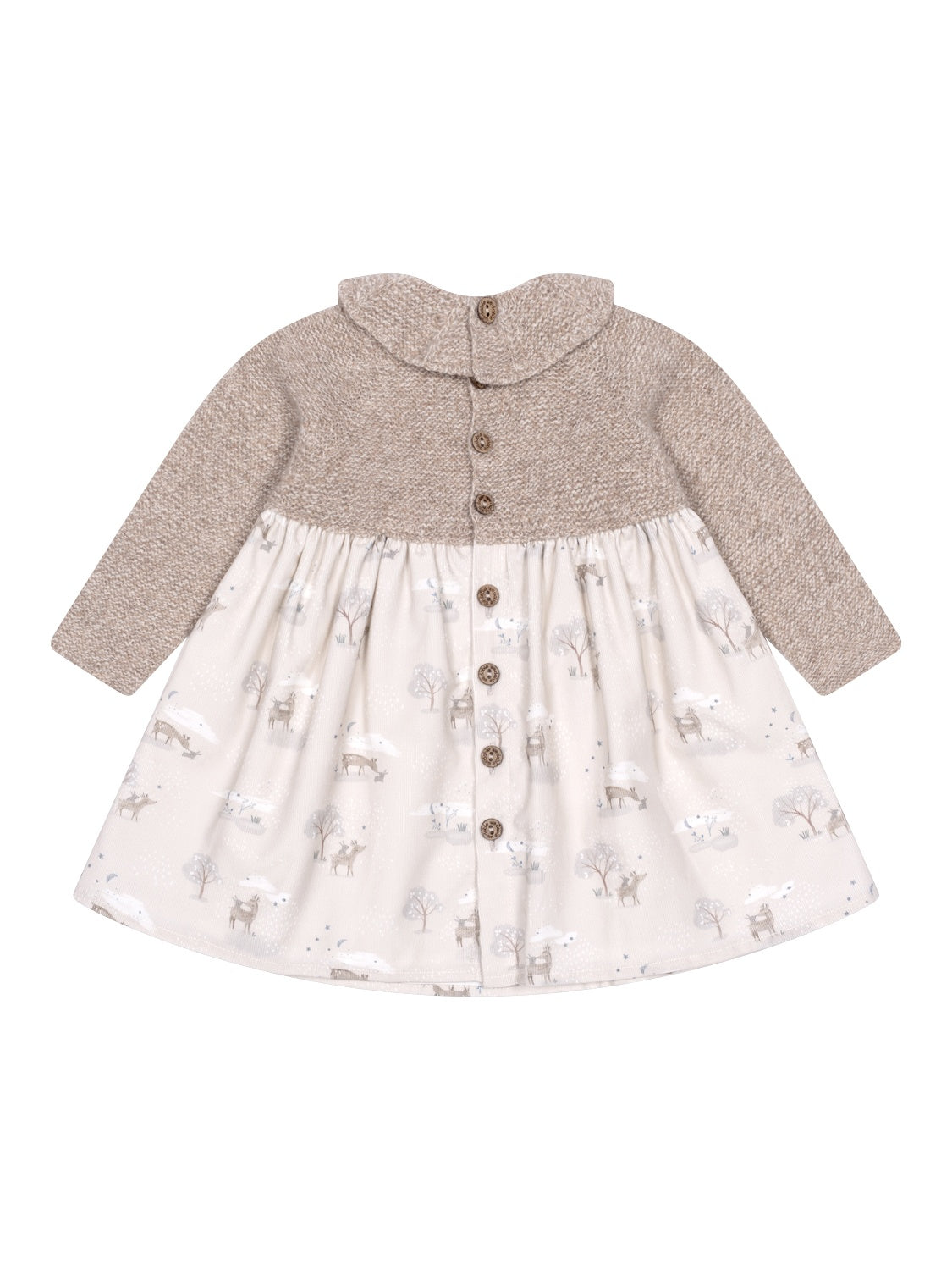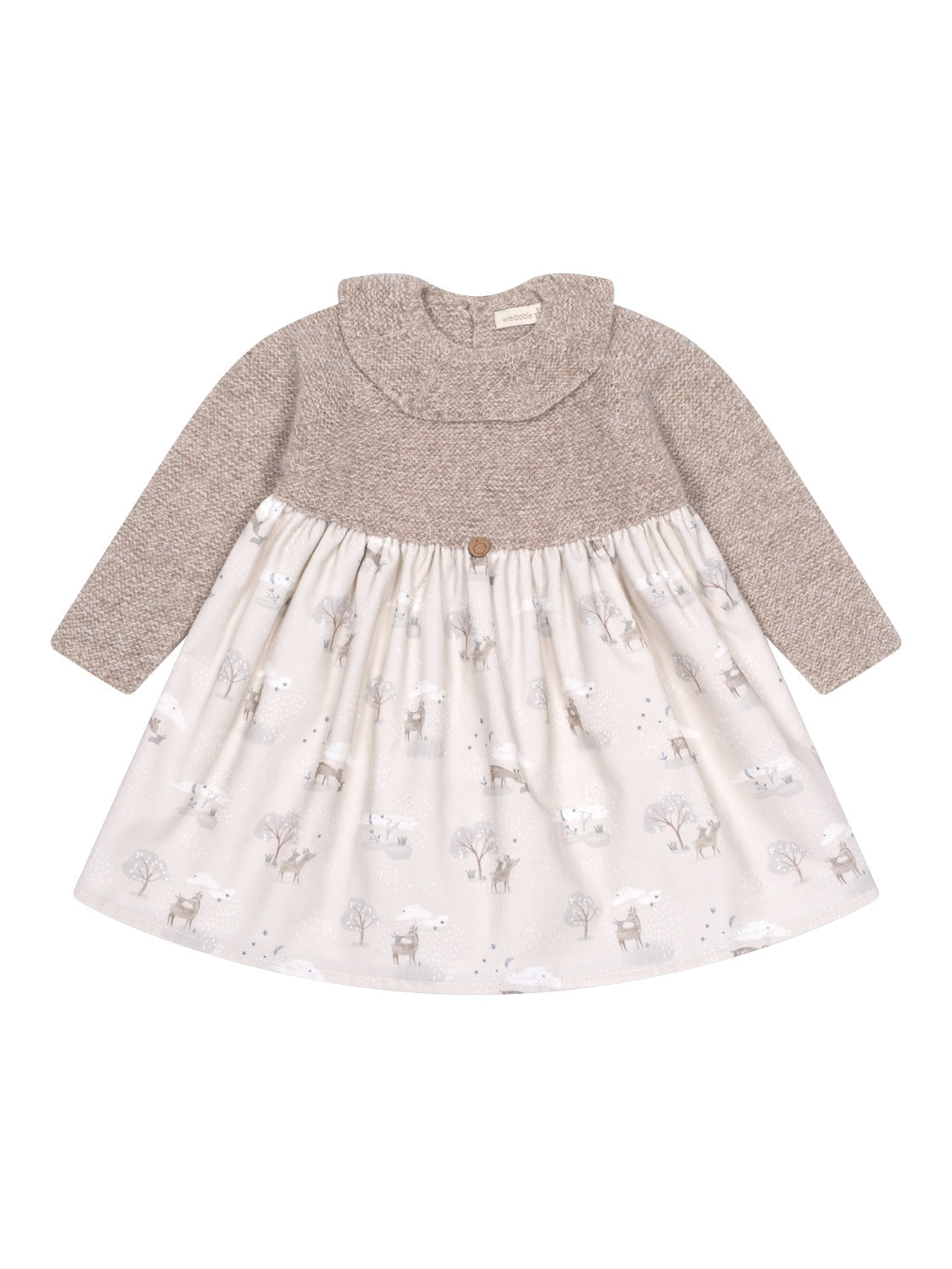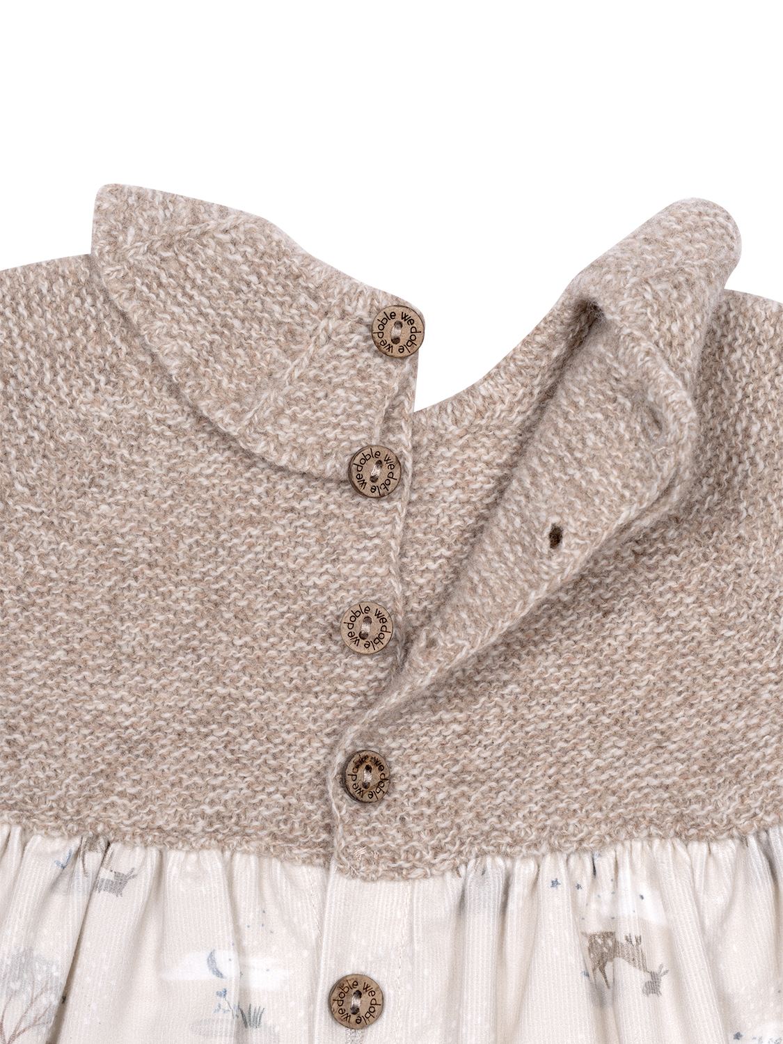 Dieses bezaubernde Kleid in Beige von Wedoble bietet einen raffinierten Materialmix, denn der obere Teil besteht aus weichem Merinowollstrick und präsentiert eine gestrickten Rüschenkragen, während der leichte Rock aus Bio-Baumwolle in Samtcord-Qualität gefertigt wird und von einem winterlichen Motiv-Print eine süße Note erhält. Für zusätzlichen Komfort ist das Kleid gefüttert. Auf der Rückseite befinden sich praktische Holzknöpfe. Hergestellt mit Wholegarment-Technologie, ist dieses nahtlose Kleid für maximalen Komfort Ihres Babys konzipiert. In der Taille verleiht ein kleinen Logo-Patch dem Kleid den letzten Schliff.